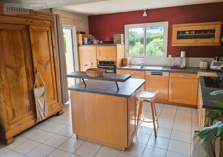 Saint-Coulomb, proche plage, maison de 2005, composée au rez-de-chaussée : d'une entrée, cuisine aménagée et équipée ouverte sur séjour donnant sur salon avec poêle à bois, une chambre, salle d'eau, wc, et à l'étage : une mezzanine desservant trois chambres, dressing, salle de bains avec douche, wc, une pièce grenier.