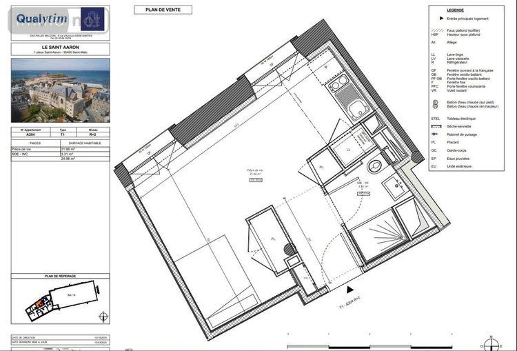 SAINT MALO - INTRA MUROS - Appartement neuf T1 de 25m² situé au 2ème étage comprenant une entrée desservant une grande pièce de vie avec cuisine ouverte et placard et une salle d'eau avec wc. Cellier privatif. Au sein de ce quartier privilégié, le Saint-Aaron jouit d'une rare position dominante et dégagée sur la place Jean Moulin, ouvrant des perspectives sur la cathédrale Saint Vincent, les toits et le ciel malouin. Un emplacement de choix pour ce bâtiment chargé d'histoire. Ancien monastère du XVIIème siècle devenu plus récemment Tribunal de Grande Instance, le Saint-Aaron est une réhabilitation inédite de bâtiments historiques en 12 magnifiques logements accueillant en son coeur l'ancienne chapelle classée à l'inventaire supplémentaire des monuments historiques.