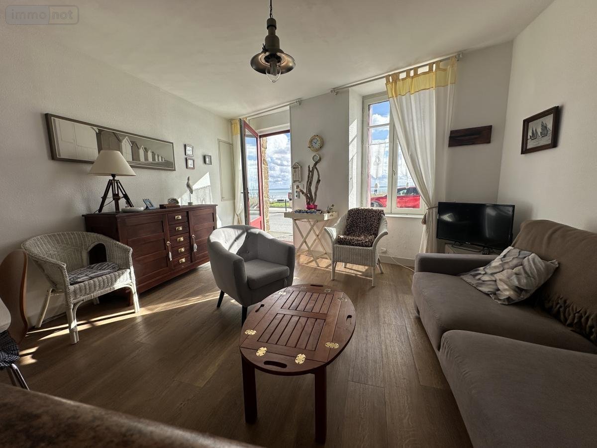 CANCALE - La Houle - Appartement T2 en rez de chaussée d'une petite copropriété en pierres comprenant une entrée dans la pièce de vie avec cuisine équipée ouverte, le tout offrant une vue sur la mer, un dégagement avec salle d'eau et wc indépendant et une chambre ayant un accès sur l'arrière de l'immeuble. Grande cave en sous-sol (55m² environ) accessible par l'extérieur. Cour Commune