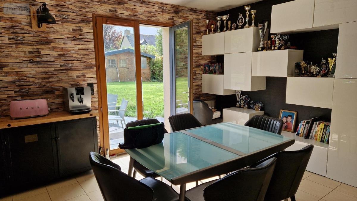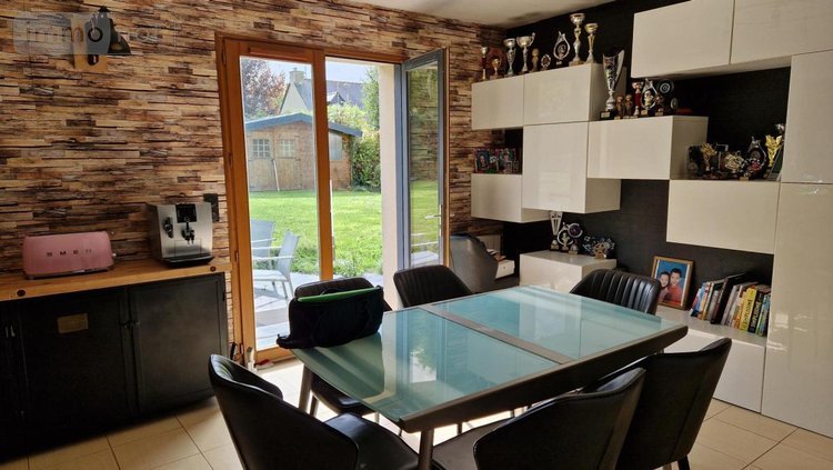 Saint Jouan des Guerets - Maison individuelle (2003) comprenant (105m²) - En rez-de-chaussée une entrée dessert une pièce de séjour avec cuisine aménagée et équipée ouverte, terrasse Sud et toilette. Au premier étage : le palier dessert quatre chambres, toilette et une salle de bains. Garage intégré. Chalet dans le jardin. Jardin (551m²)