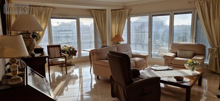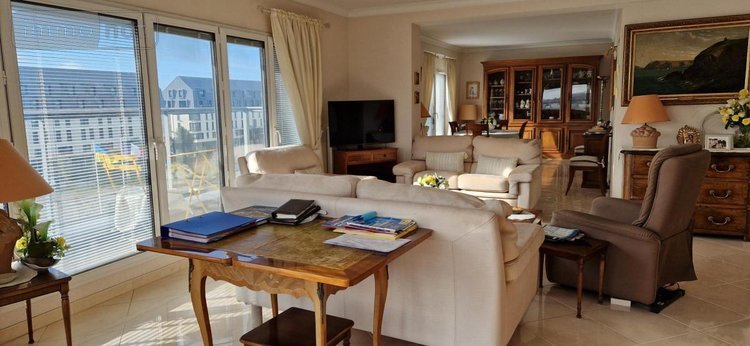 Saint Malo - Médiathèque - Lumineux appartement (sud) en bon état (105.89m²) - Vue surplombante sans vis-à-vis (4eme étage - Asc.) - Hall d'entrée desservant salon (balcon), séjour, cuisine, arrière-cuisine, placards, deux chambres, toilette et une salle de douches. Garage fermé en sous-sol.