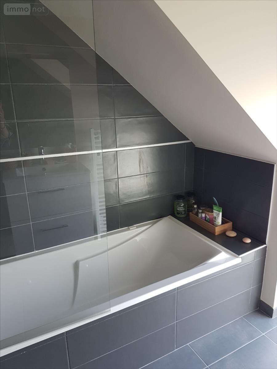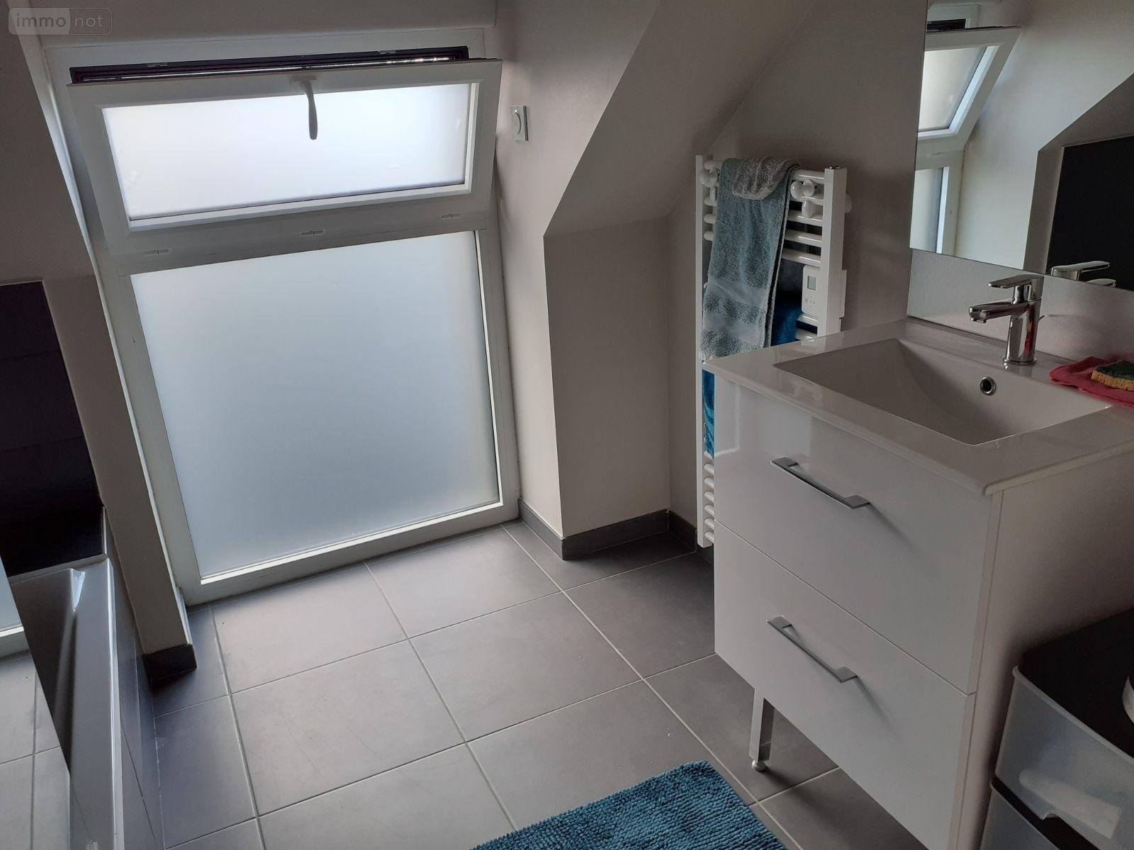 A l'étage : le palier dessert 2 chambres avec chacune un placard, une salle de bain (baignoire, vasque sur meuble), wc.