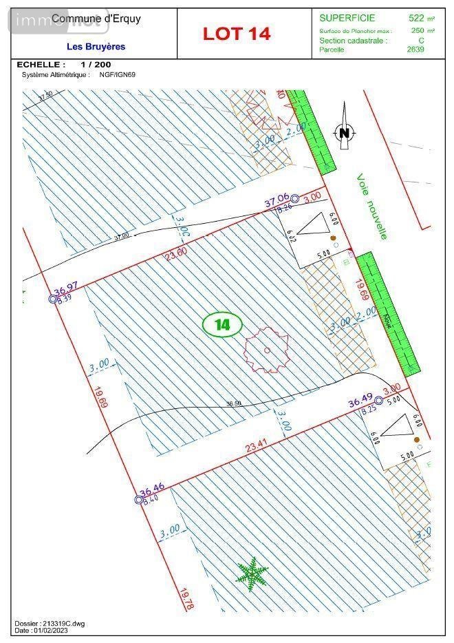 Lots de terrains à bâtir situés à proximité du centre d'Erquy au sein d'un lotissement de 16 lots. D'une surface entre 370m2 et 528m2, les lots seront vendus bornés et viabilisés, parfait pour y installer votre maison individuelle (libre de constructeur). Prix pour terrain de 522m2 : 145 246EUR honoraires d'agence inclus soit 138 330EUR net vendeur (5% charge acquéreur). non soumis au DPE.
