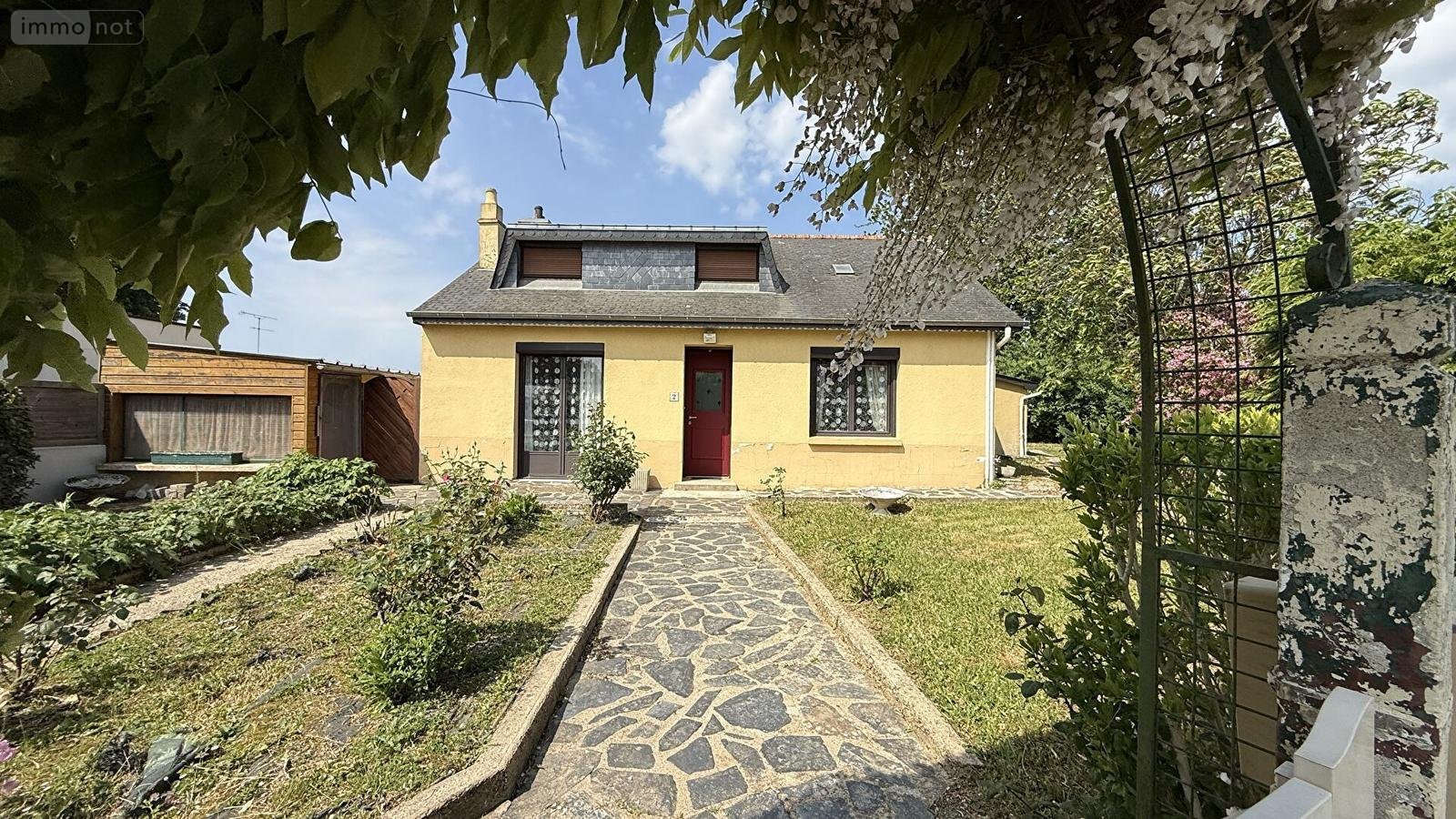 Menuiseries aluminium récentes au RDC, assainissement collectif et toiture en ardoises naturelles sur la maison.