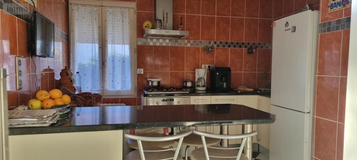 Entrée, salle à manger avec cheminée, cuisine aménagée et équipée avec espace repas, salon, salle d'eau avec wc.