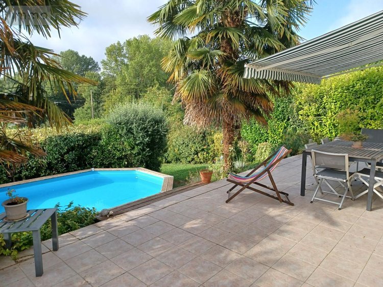 Terrasse au sud, piscine hors sol, jardin arboré, garage pour deux véhicules.