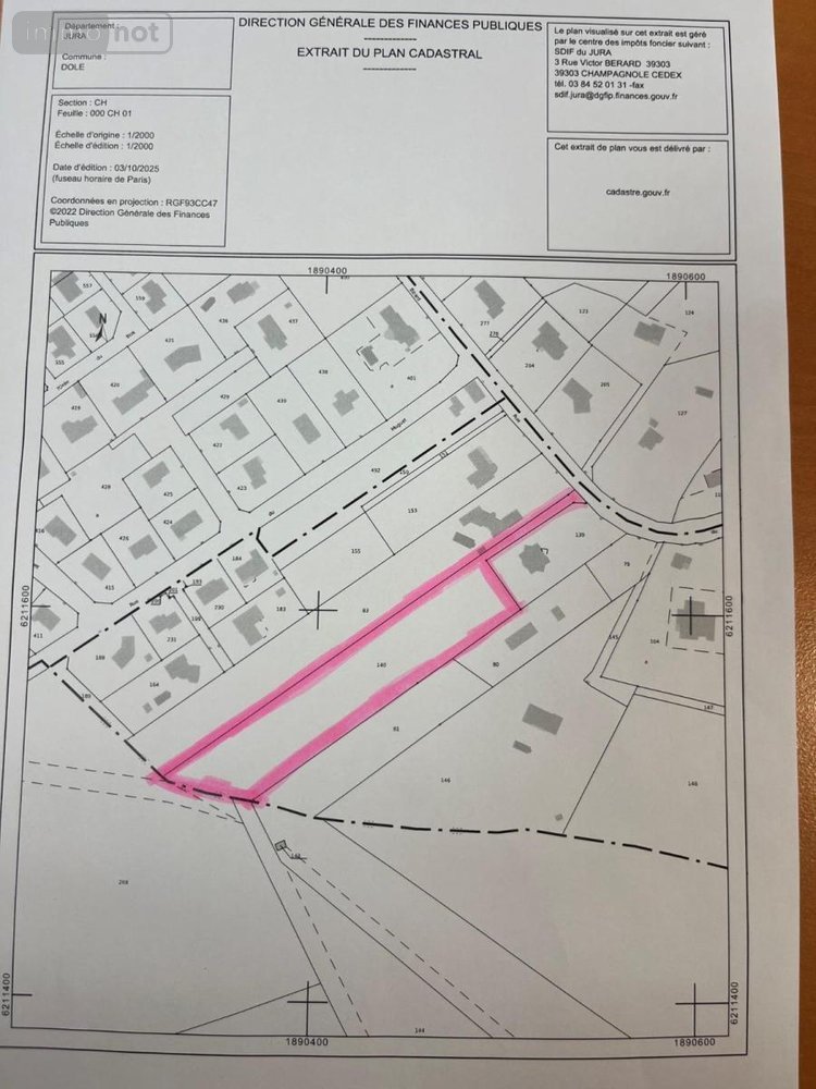 Commune de DOLE Parcelle de 7390 m² en partie constructible. Réseaux en bordure. Coordonnées négociateur : Mélanie MOURCELY, Mobile : 07 78 41 43 41, Email : [email protected]; Coordonnées étude: SCP BARTHEN RUIZ VANDEL8 rue Joseph Thoret 39100 DOLE Les informations sur les risques auxquels ce bien est exposé sont disponibles sur le site Géorisques : www. georisques. gouv. fr