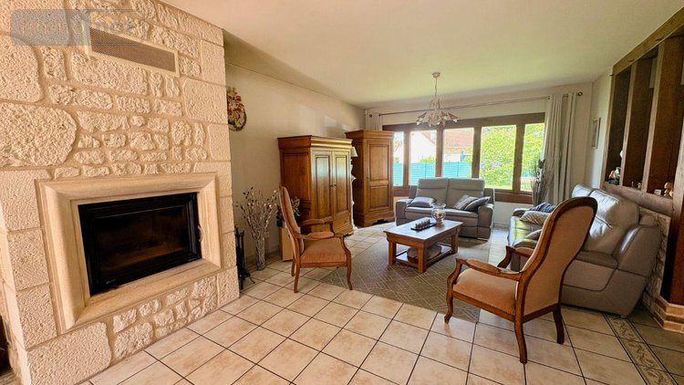 Elle offre une spacieuse pièce de vie avec salon, salle à manger et cheminée insert, ainsi qu'une grande cuisine aménagée et équipée donnant sur une large terrasse agréable.