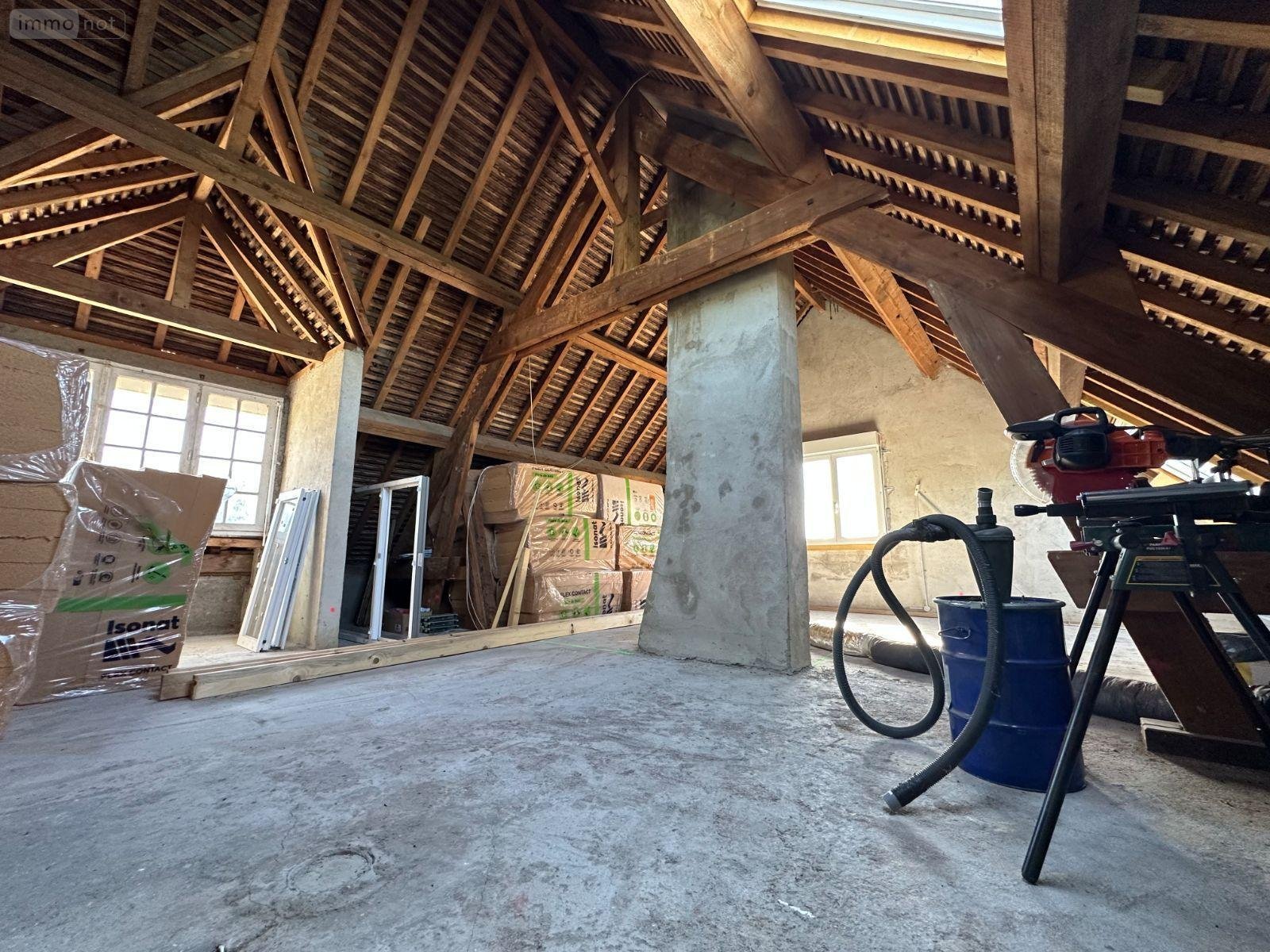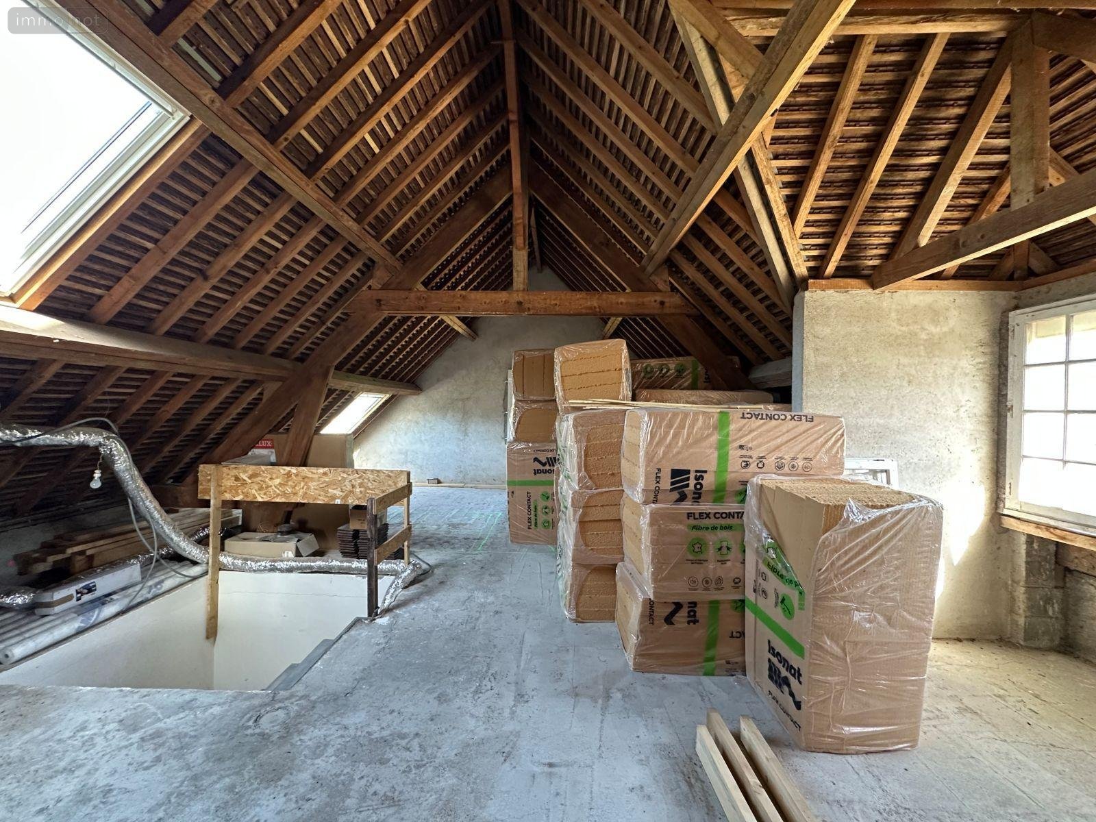 Un escalier dessert l'étage d'environ 65m² à aménager : plancher béton, fenêtres en double vitrage et isolant déjà disponible.
