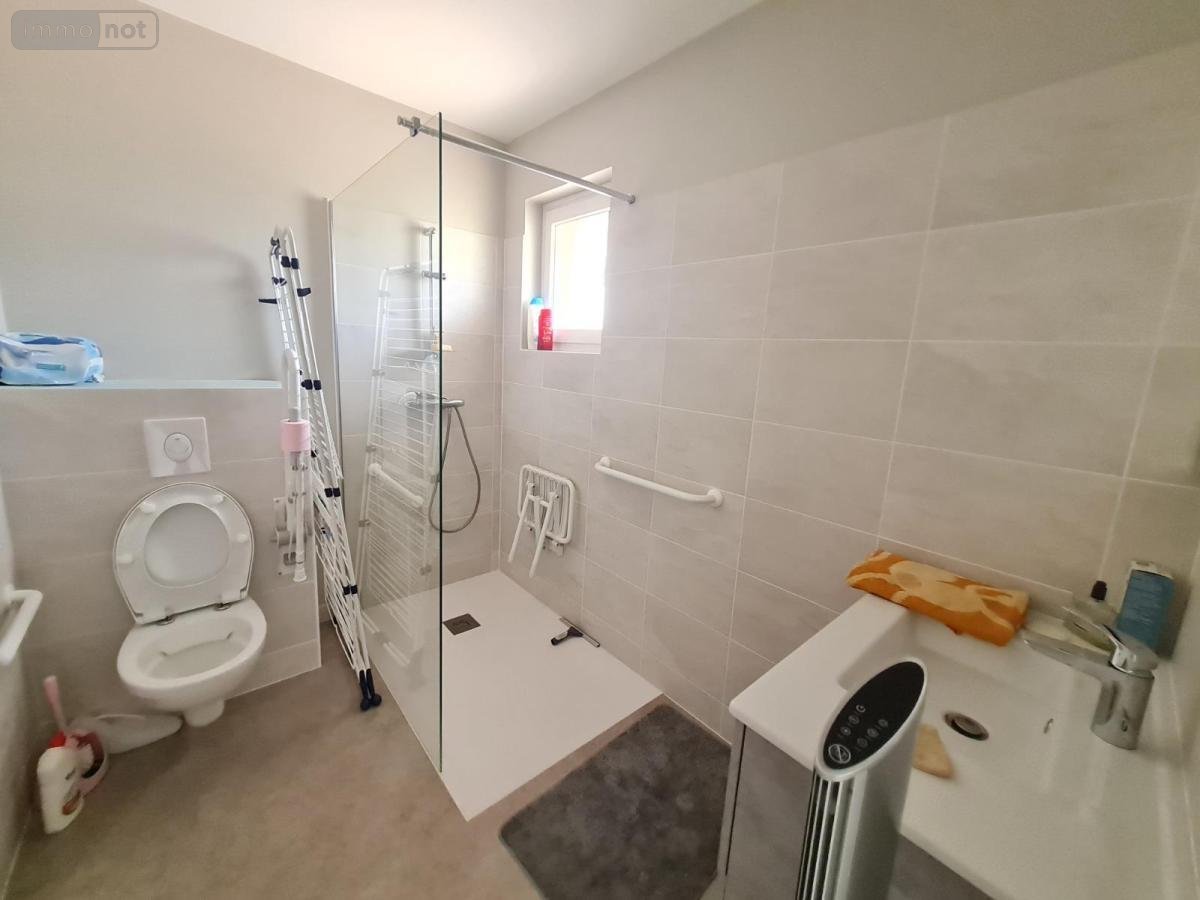 / au rdc: salon/ séjour, couloir avec placard, salle de douche (lavabo, douche), wc, chambre, cuisine aménagée et équipée (éléments hauts et bas, évier 2 bacs, four, plaque 4 feux gaz, hotte), pièce traversante, salle de douche accès PMR (wc, douche italienne, meuble vasque), deux chambres. Garage.