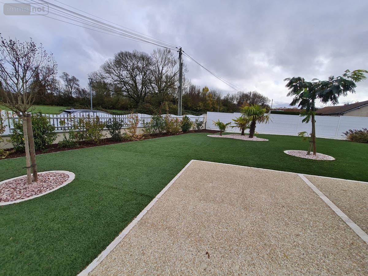 Maison de plain- pied à usage d'habitation comprenant: entrée avec placard, WC avec lave-mains, débarras, cuisine aménagée équipée ( éléments haut et bas, évier 2 bacs, plaque 4 feux vitrocéramique, four, hotte), salon/ séjour, chambre, chambre avec placard, salle de douche ( douche italienne, meuble vasque, placard). Garage attenant avec évier et placard, chambre avec placards.