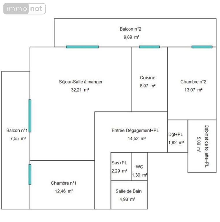 Il se compose d'une entrée avec placards, d'un salon/séjour de 32 m², d'une cuisine indépendante, de deux chambres de 12,46 m² et 13 m², d'une salle de bains et d'un WC séparé.