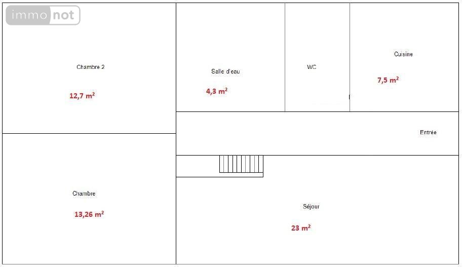 - Rez-de-chaussée : Entrée, Cuisine indépendante (7,50 m²), Séjour lumineux (22,96 m²), 2 chambres spacieuses (13,26 m² et 12,67 m²), Salle d'eau (4,27 m²), WC séparés.