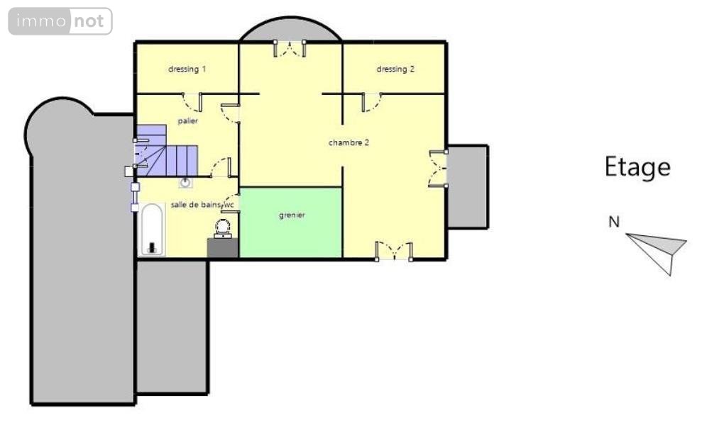 À l'étage, un palier dessert une grande chambre (30 m²) avec salon privatif, deux débarras et une salle de bains avec WC.