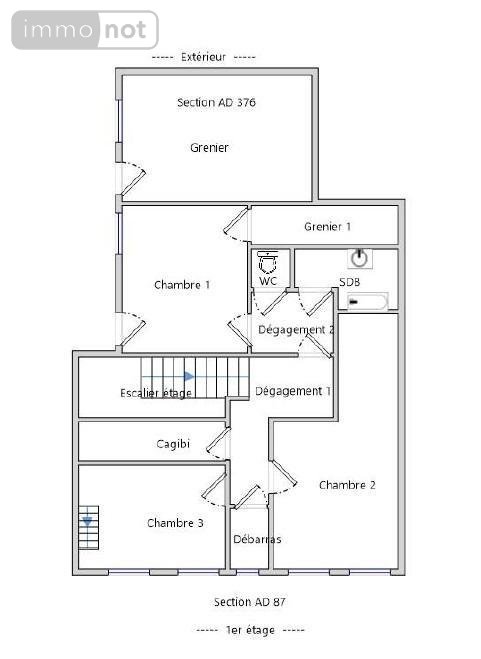 A l'étage : palier, salle d'eau (5,6 m²), W.C, 1 chambre (18 m²) avec partie de grenier, seconde partie de grenier aménageable (54 m²), débarras (7,14 m²), 2 chambres (15 m² et 20,33 m²), débarras (3,54 m²).