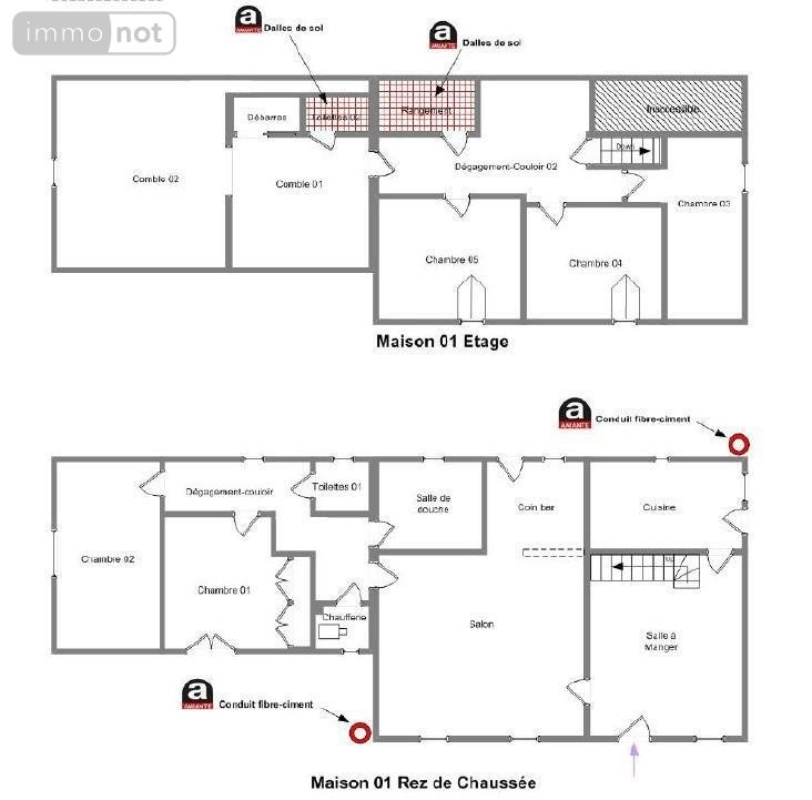 1) Une maison principale de 158 m², comprenant : Au rez-de-chaussée : cuisine aménagée et équipée (24.43 m²), arrière cuisine/buanderie (12 m²), séjour (34.21 m²) et coin bar (7.52 m²), salle d'eau, chaufferie, 2 chambres (13.64 m² et 16.10 m²). A l'étage mansardée : trois chambres, W.C, partie de grenier aménageable en chambre supplémentaire. Prestations : double-vitrage PVC (RDC), simple vitrage bois (1er), chauffage central au fioul avec production d'eau chaude (chaudière 2010), poêle à bois, fosse septique, tableau électrique récent.