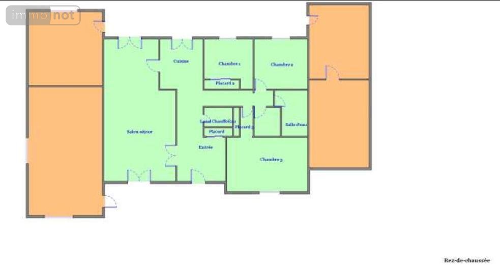 Au rez-de-chaussée : entrée, séjour (33,09 m²), cuisine (9.4 m²), cellier, 3 chambres (10.75 m², 11.92 m² et 10.51 m²), salle d'eau (4 m²), W.C.