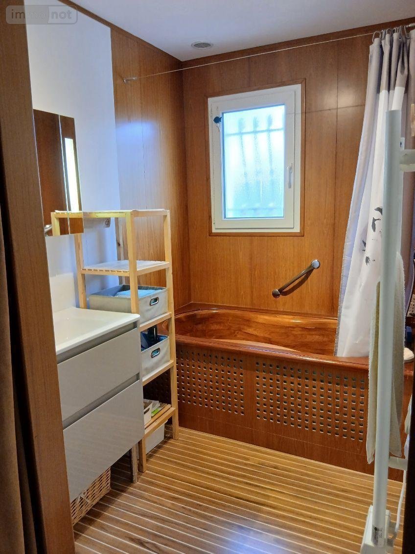 A l'étage (en ½ étages) : espace nuit comprenant 3 grandes chambres avec placards et 1 suite parentale avec dressing et salle de bains (baignoire originale en teck, murs et placards en teck), salle d'eau indépendante, WC séparés avec lave mains.