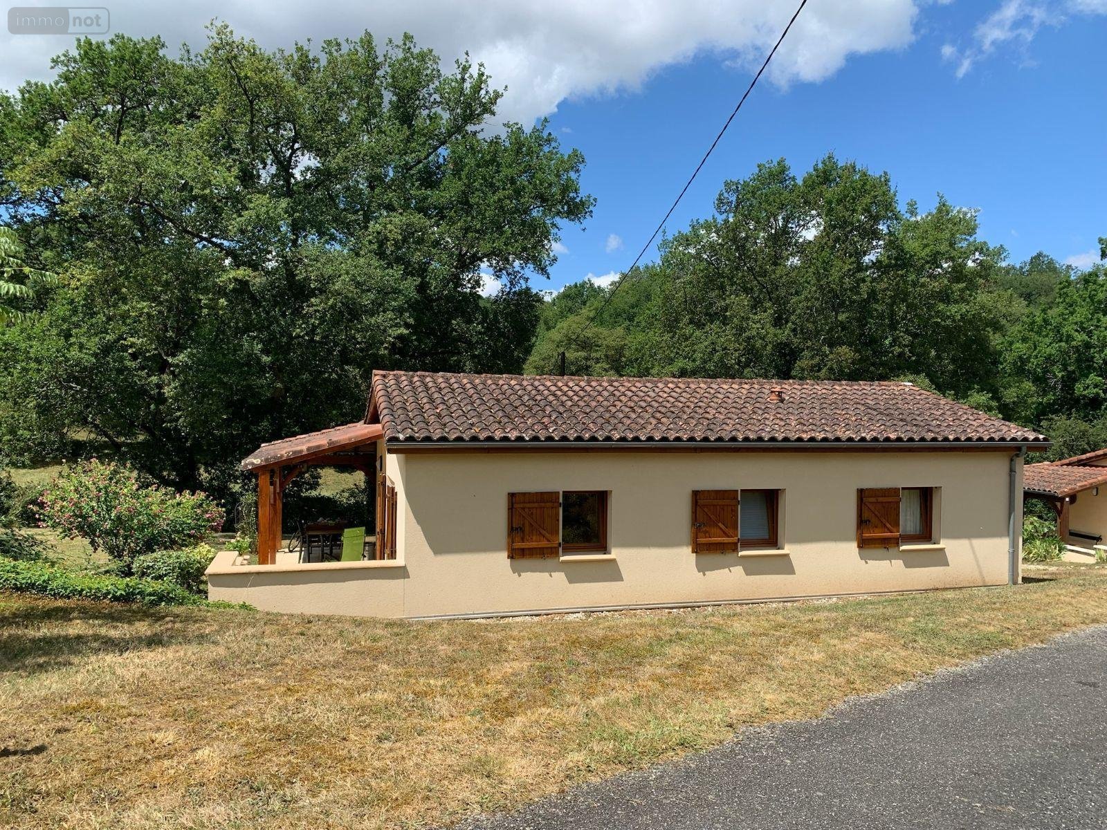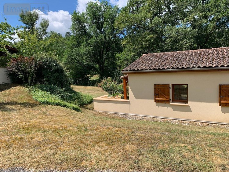 A VENDRE : Dans village de vacances proche GOURDON (Lot - 46), maison de plain-pied en très bon état comprenant : pièce principale avec coin cuisine équipée (25m²), dégagement, trois chambres avec placard, salle d'eau, toilettes avec lavabo. Cette maison lumineuse dispose d'un double vitrage bois avec des volets bois, d'un chauffage électrique au sol dans le salon et la salle d'eau. Elle est raccordée à l'assainissement collectif. Jardin privatif. Aucun travaux à prévoir car maison impeccable.