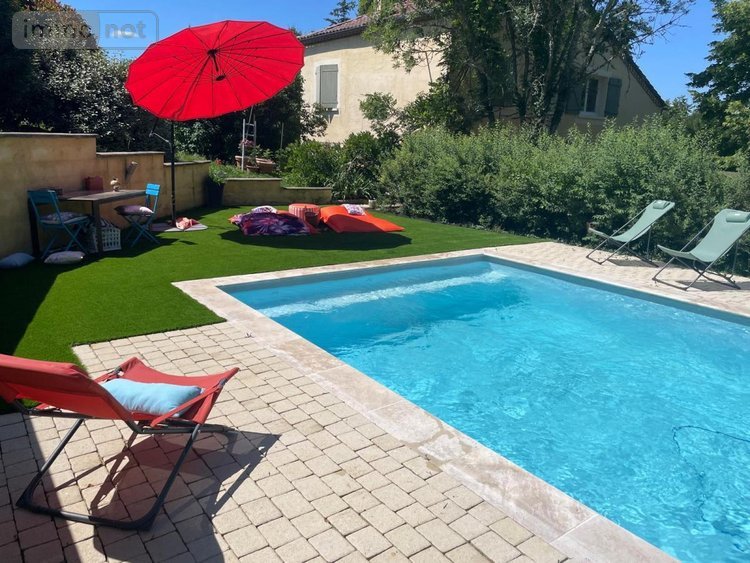 La piscine aux dimensions 8x4 prend place à côté de la terrasse.