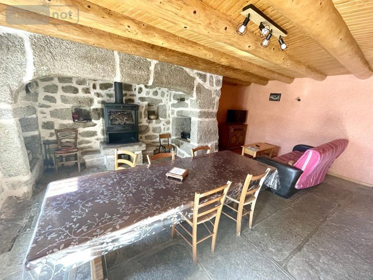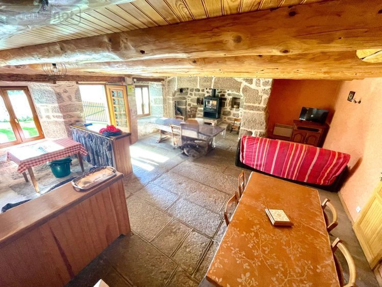 Rez-de-chaussée : Une vaste pièce de vie conviviale mettant à l'honneur la pierre apparente, un plafond avec poutres massives et un imposant cantou (cheminée traditionnelle) équipé d'un poêle à bois. Le sol en dallage de pierre souligne l'authenticité du lieu.