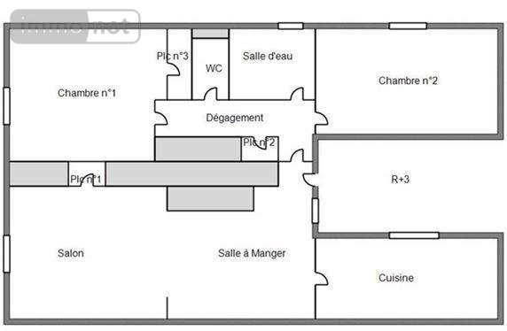 Une salle à manger et salon avec cheminée, un placard, une cuisine ouverte, un dégagement avec placard, deux chambres, wc et salle d'eau.