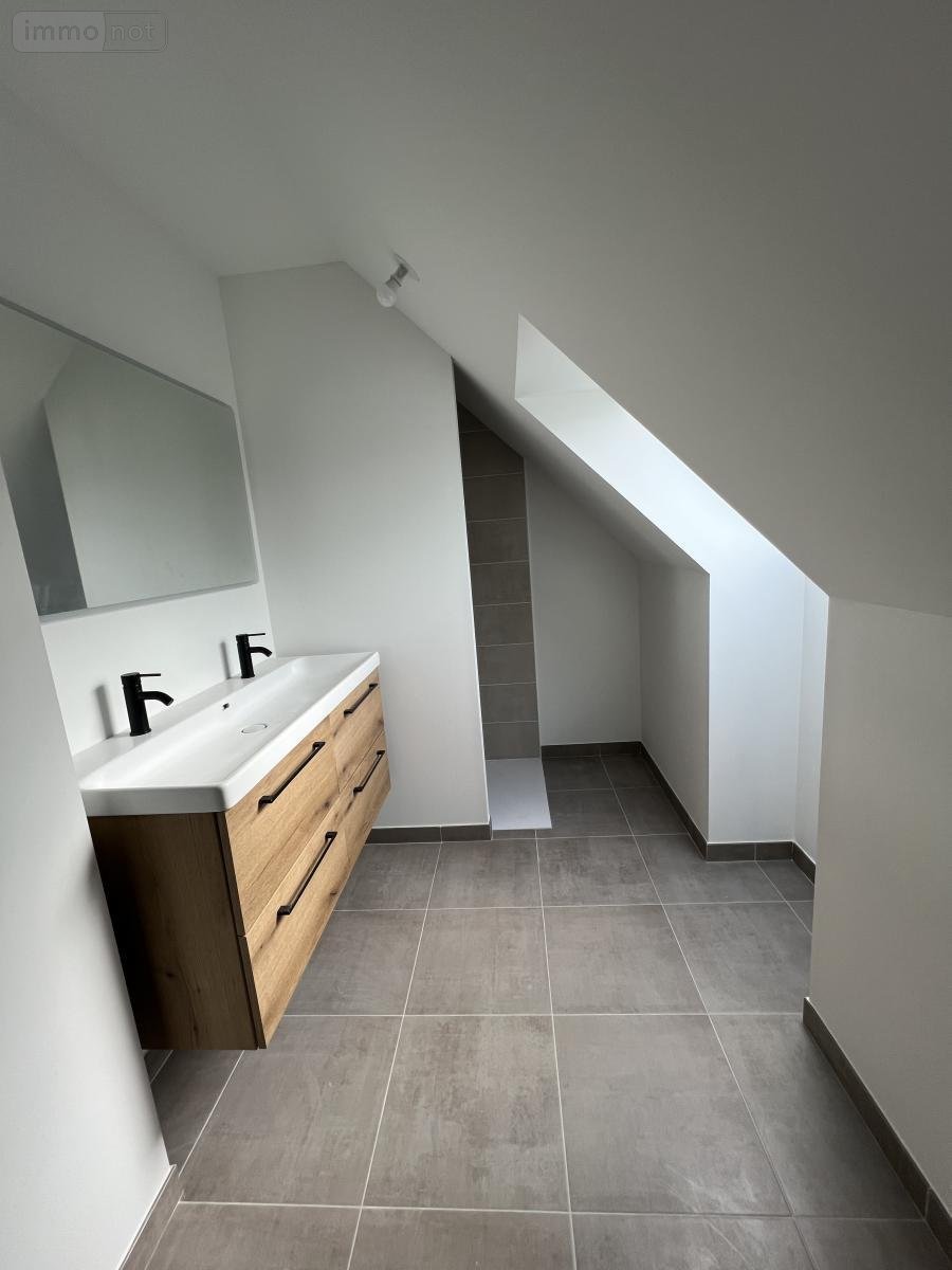 Maison normes PMR entièrement neuve de 84m² à louer à Saint-Germain-des-Prés, loyer de 995€ charges non comprises, comprenant à l'étage, trois chambres, une salle d'eau avec WC séparé, au rez de chaussée, une entrée sur salon séjour, une cuisine aménagée et équipée d'un four, d'une hotte et d'une plaque de cuisson, et un WC séparé.