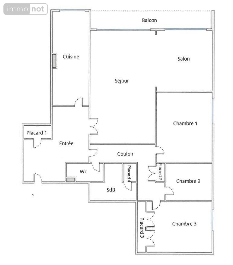 Il se compose d'une entrée avec placard, d'un salon-séjour de 32 m² ouvrant sur un balcon, d'une cuisine aménagée et équipée, de 3 chambres, d'une salle de bains (baignoire + douche), d'un WC, d'un séchoir et de nombreux rangements.