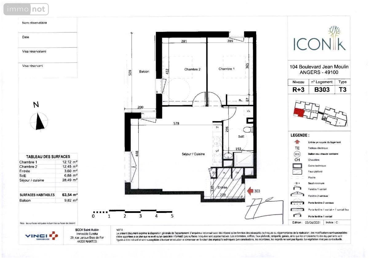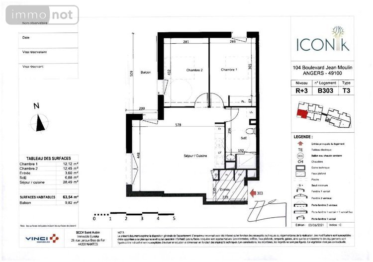 Une entrée, couloir, un salon ouvert sur cuisine aménagée-équipée, 2 chambres, une salle d'eau avec WC, un balcon de 10m2
