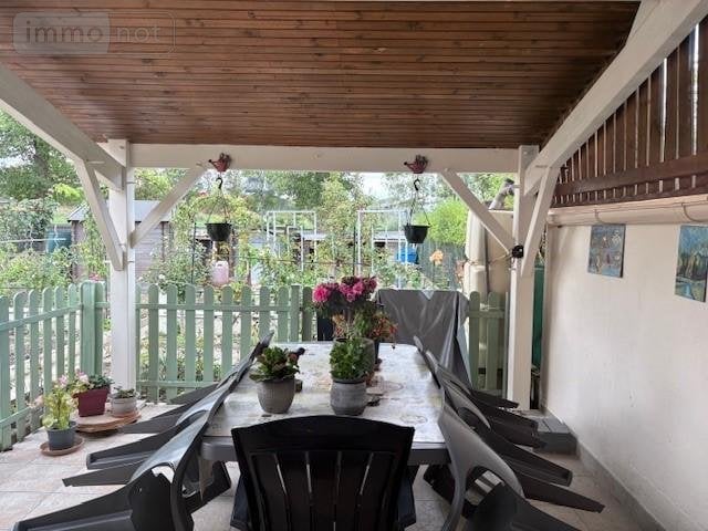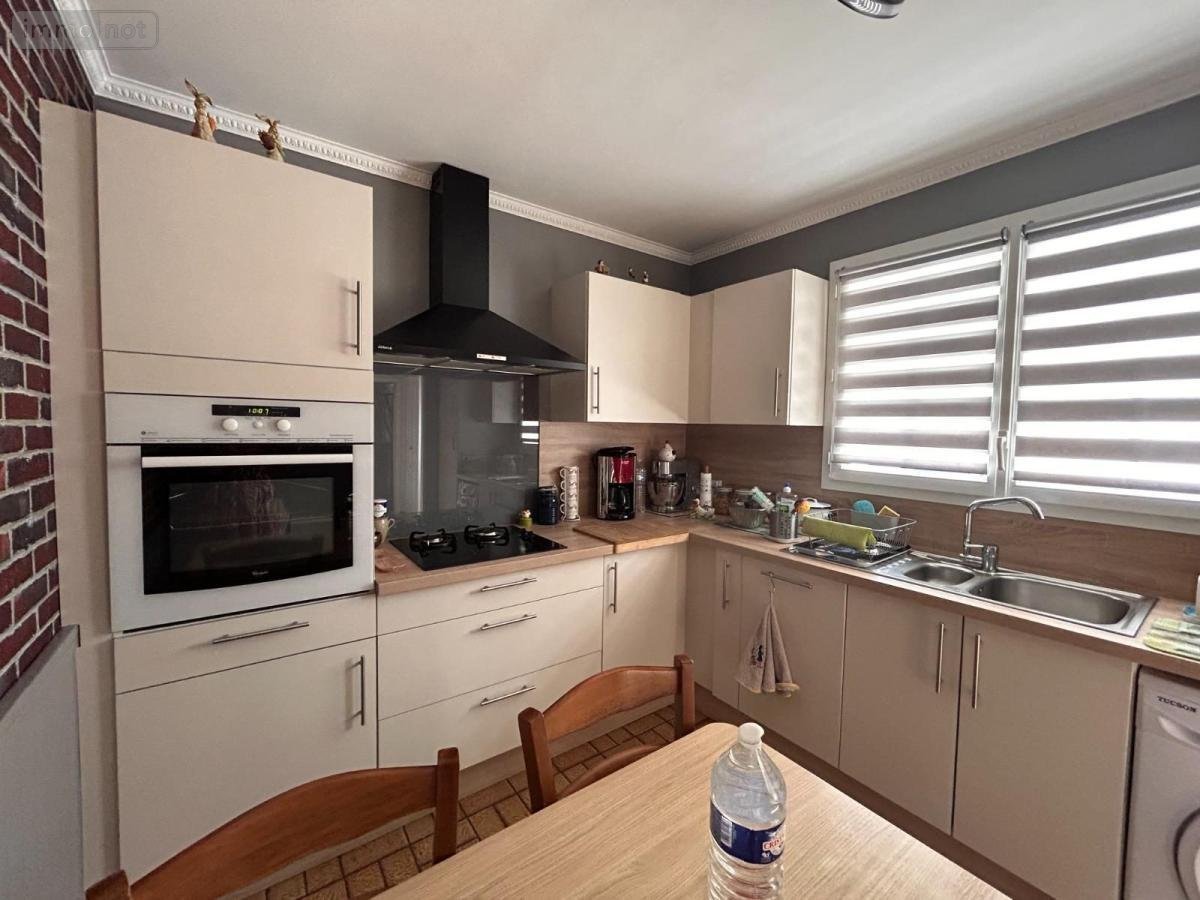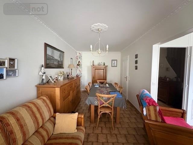 Maison composée en RDC : Entrée, cuisine, salon salle à manger et WC. A l'étage : 3 chambres, une salle de bains. Garage. Appentis avec terrasse. Jardin.