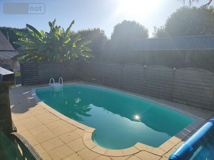 Piscine extérieure avec un abri et un solarium, entièrement clôturée.