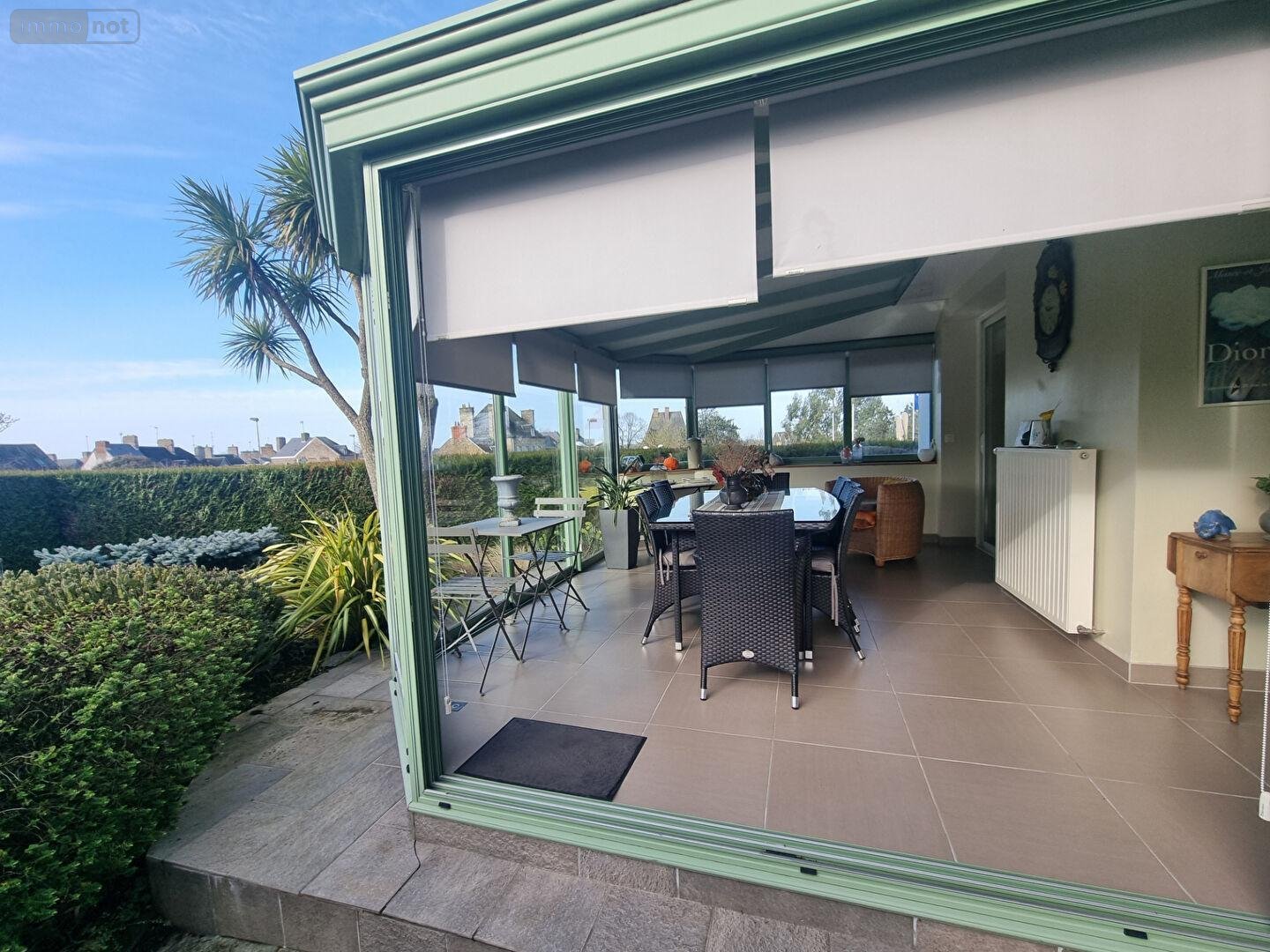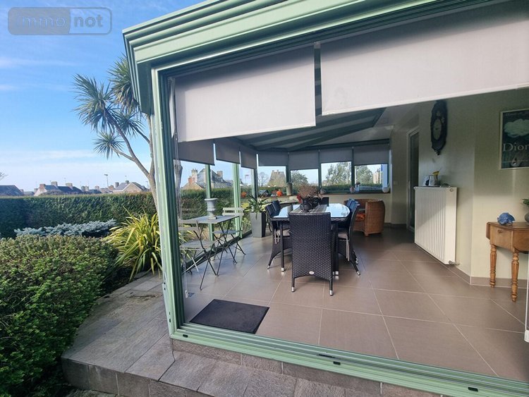 Véranda lumineuse, cuisine aménagée et équipée, salle à manger chaleureuse avec insert à granulés, WC, deux chambres, cabinet de toilette, salle d'eau et dressing.