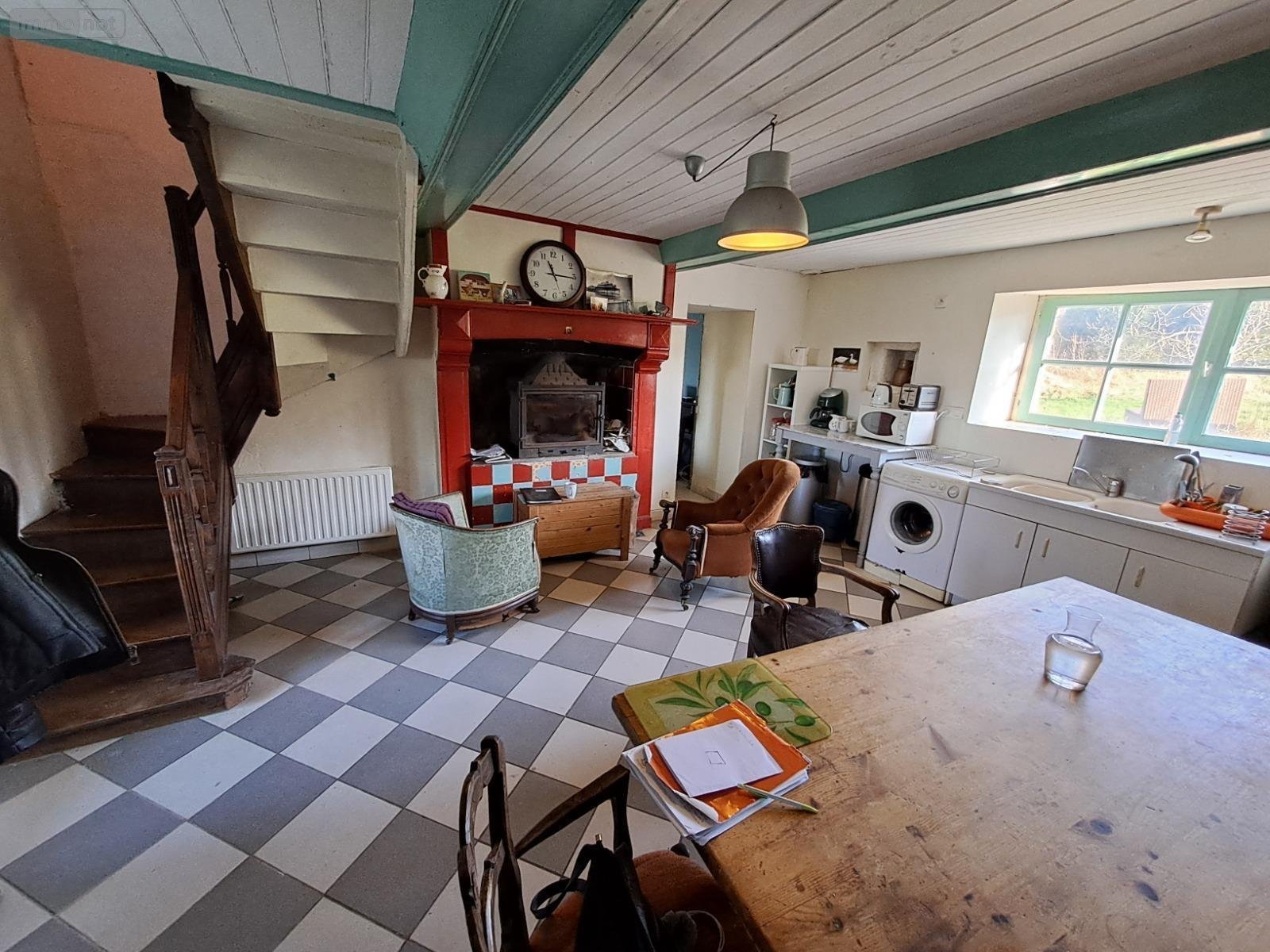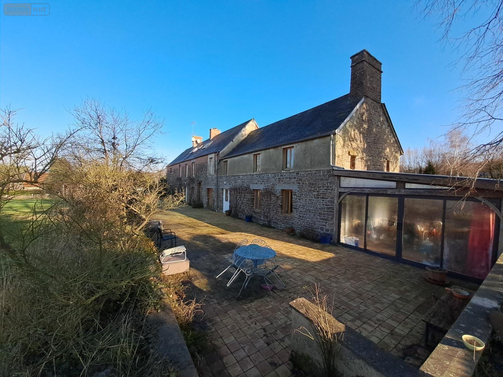 L'étude notariale de Maitre Cécile BROUST, vous propose à la vente une grande maison en pierre divisée en deux habitations mitoyennes, à Domjean dans la Manche (50), comprenant :