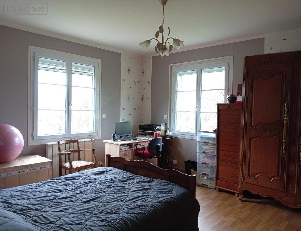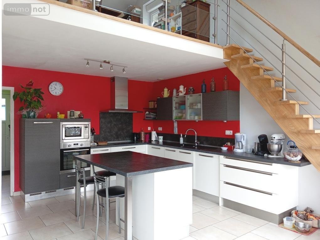 Au rez-de-chaussée : Cuisine aménagée et équipée avec table centrale et chaises, pièce de vie avec poêle à bois, grande chambre de 20m², salle d'eau et wc indépendant, cellier/buanderie, wc avec lave-mains