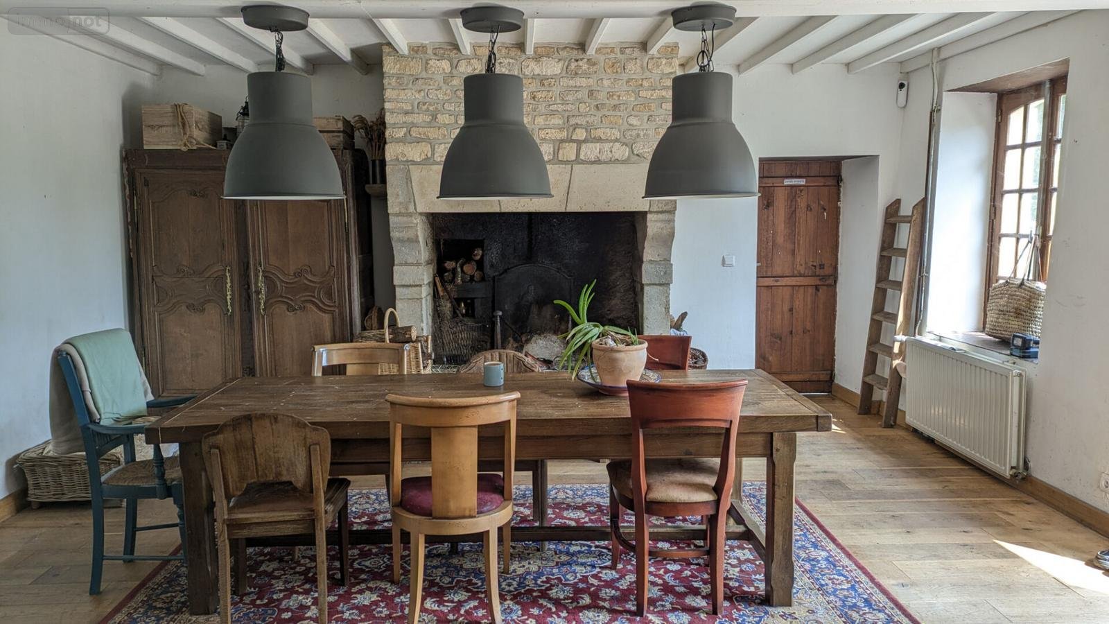 Au rez-de-chaussée : grande pièce à vivre : cuisine ouverte meublée et équipée et grande salle avec une très belle cheminée en pierre, couloir desservant une ancienne salle d'eau (à réhabiliter) et W.C., 1 chambre, et son dressing un salon équipé d'un poêle à granulés,