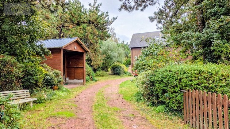 CHARMANTE MAISON en ossature bois proche de la mer, sur joli terrain arboré et clos de 2495 m², comprenant :