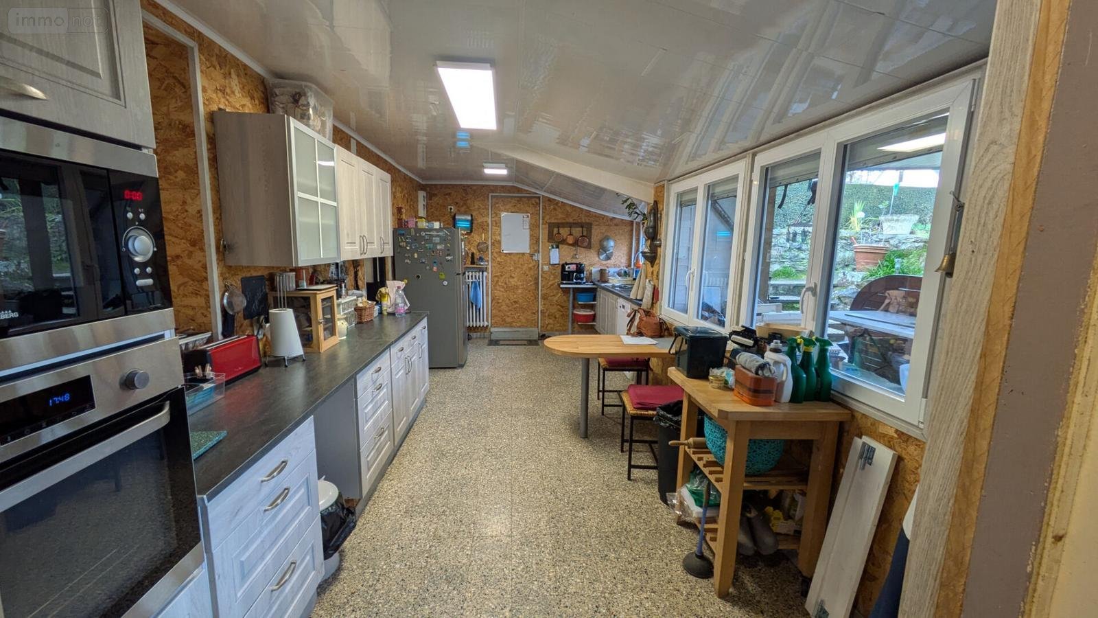 - Rez-de-chaussée : Belle entrée et couloir traversant, W.C. avec lave-mains fenêtre + volet, salle/salon avec cheminée équipée d 'un insert, et une grande cuisine en extension côté jardin donnant accès à une buanderie et une réserve + accès direct au garage.