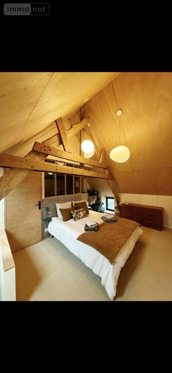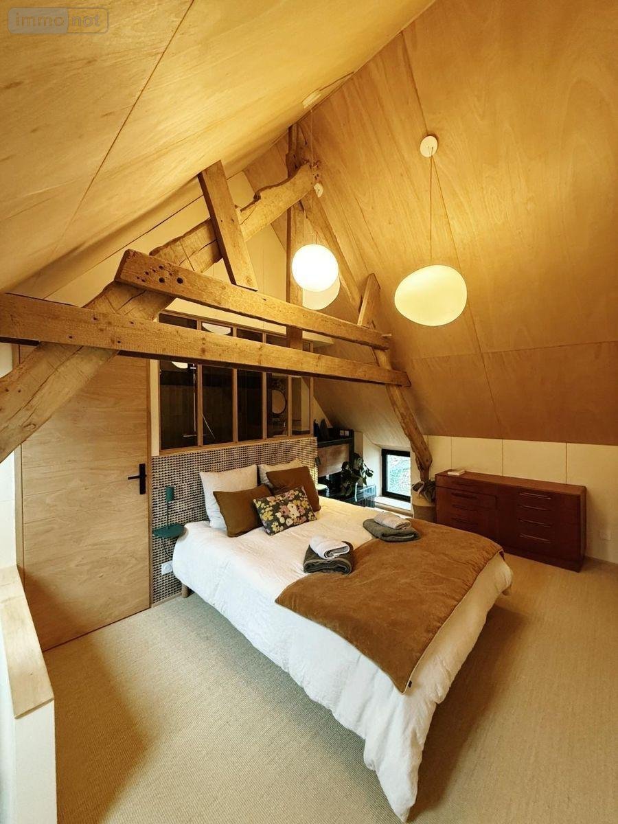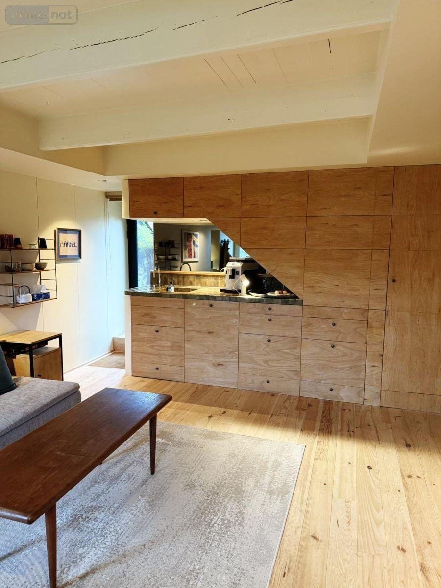 distribution au rez de chaussée : salon, cuisine sur mesure entièrement équipée, optimisation des volumes, beaux métériaux. A l'étage, chambre mansardée en suite, douche à l'italienne derrière verrière en chêne faisant office de tête de lit, vasque et moblilier bois sur mesure, wc indépendant.