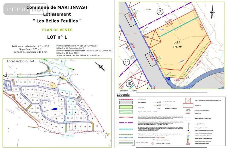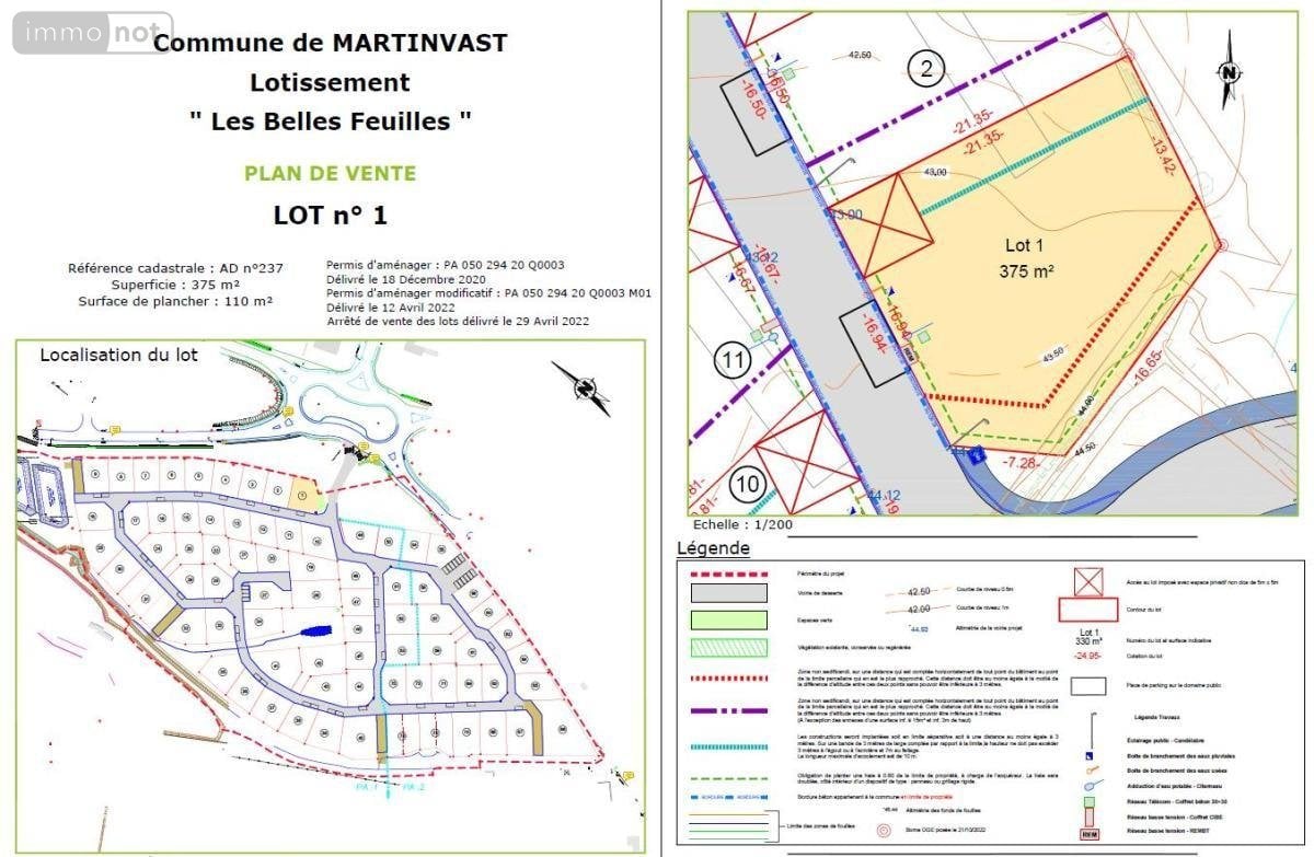 ref 1081 - MARTINVAST, dans lotissement, TERRAIN A BATIR d'une superficie de 375 m2, viabilisé en eau, assainissement, télécom, fibre et électricité. Surface de plancher possible de 110 m2.Les informations sur les risques auxquels ce bien est exposé sont disponibles sur le site Géorisques : www. georisques. gouv. fr Toutes nos annonces sur www.etudenapoleon.notaires.fr