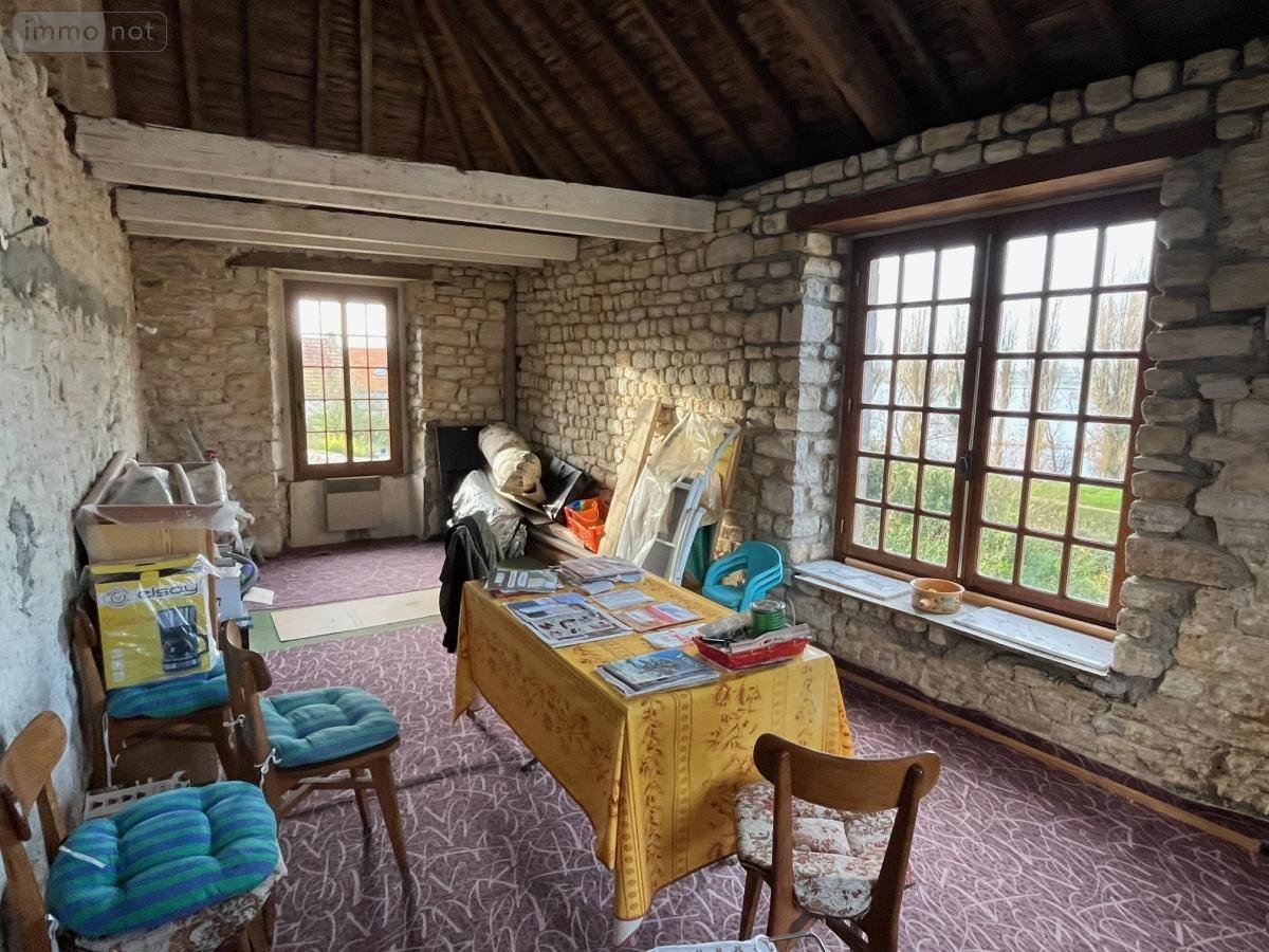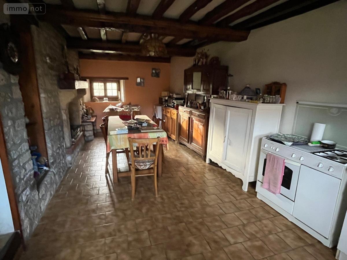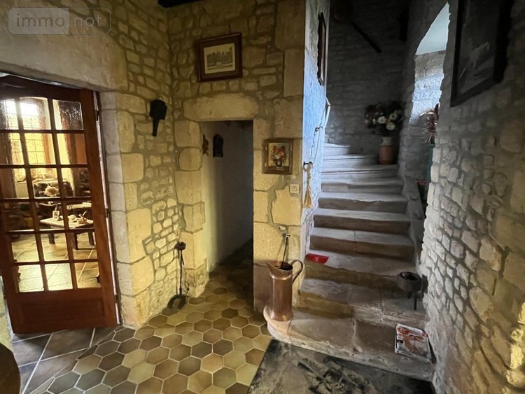Hall d'entrée avec départ d'escalier en pierres, séjour / salon avec cheminée 80 m² avec autre escalier en pierres, cuisine 20 m², wc avec lave-mains,