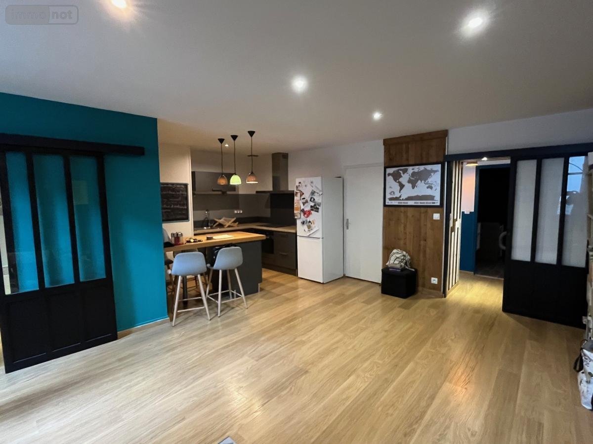 Entrée avec placard / penderie, séjour avec cuisine ouverte aménagée (éléments bas, plaque de cuisson, hotte, tale à manger), une chambr avec placard, salle de douches, wc séparé,