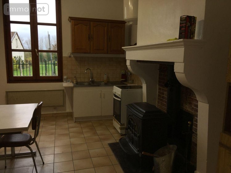 Cuisine avec poêle à bois, petit salon donnant accès au jardin.
