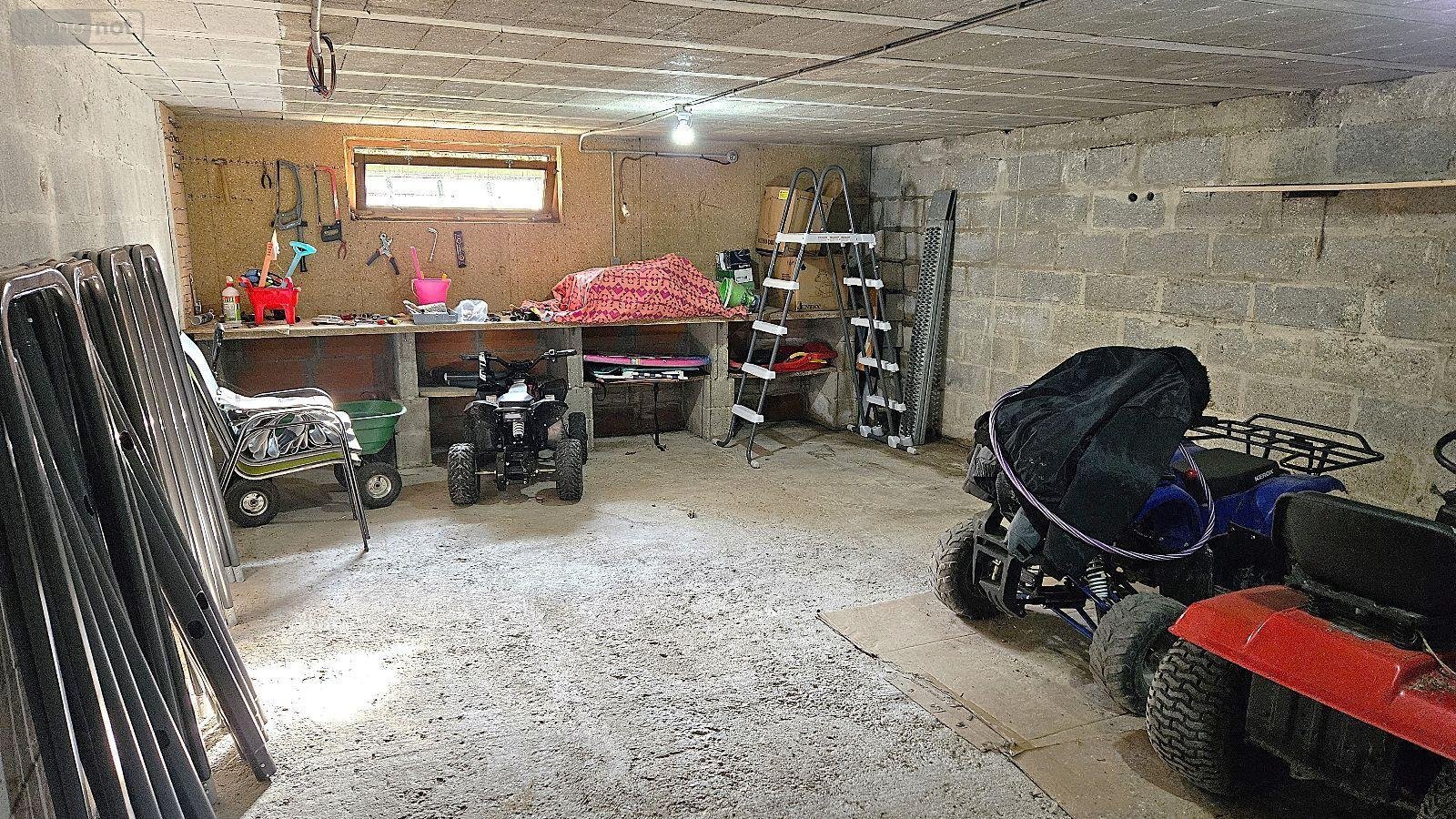 Sous-sol complet comprenant: un espace garage avec porte motorisée, un atelier et stockage, une partie cave.