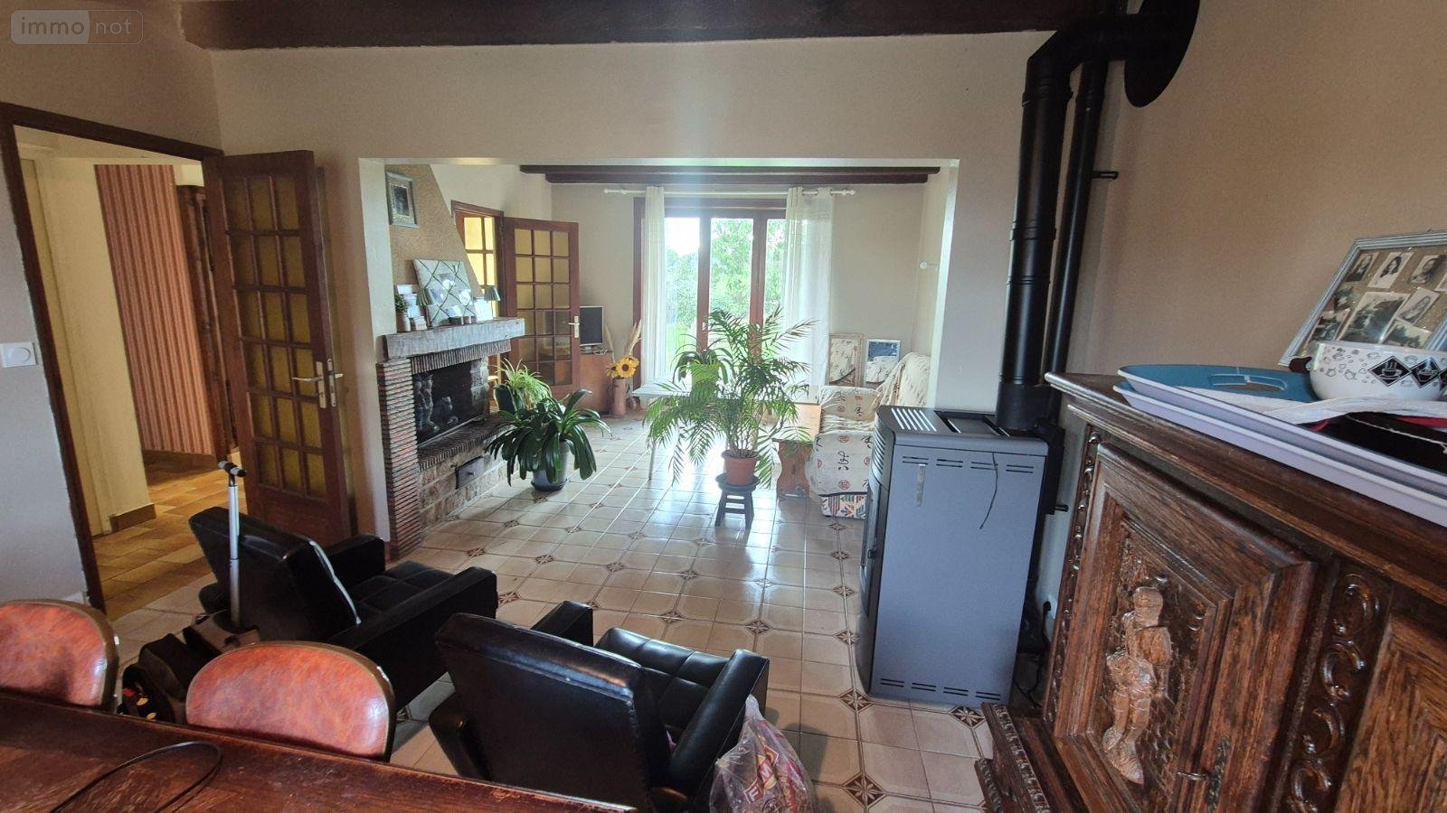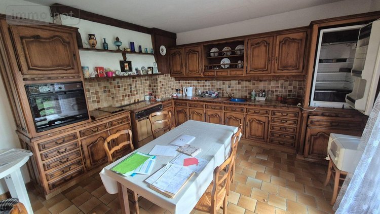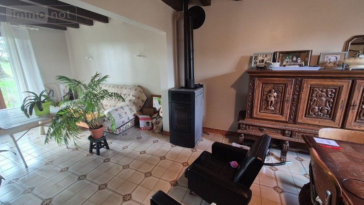 - Hall d'entrée, salon/séjour avec poêle à granulés, cuisine aménagée et équipée, dégagement, salle de bains, Wc, trois chambres.