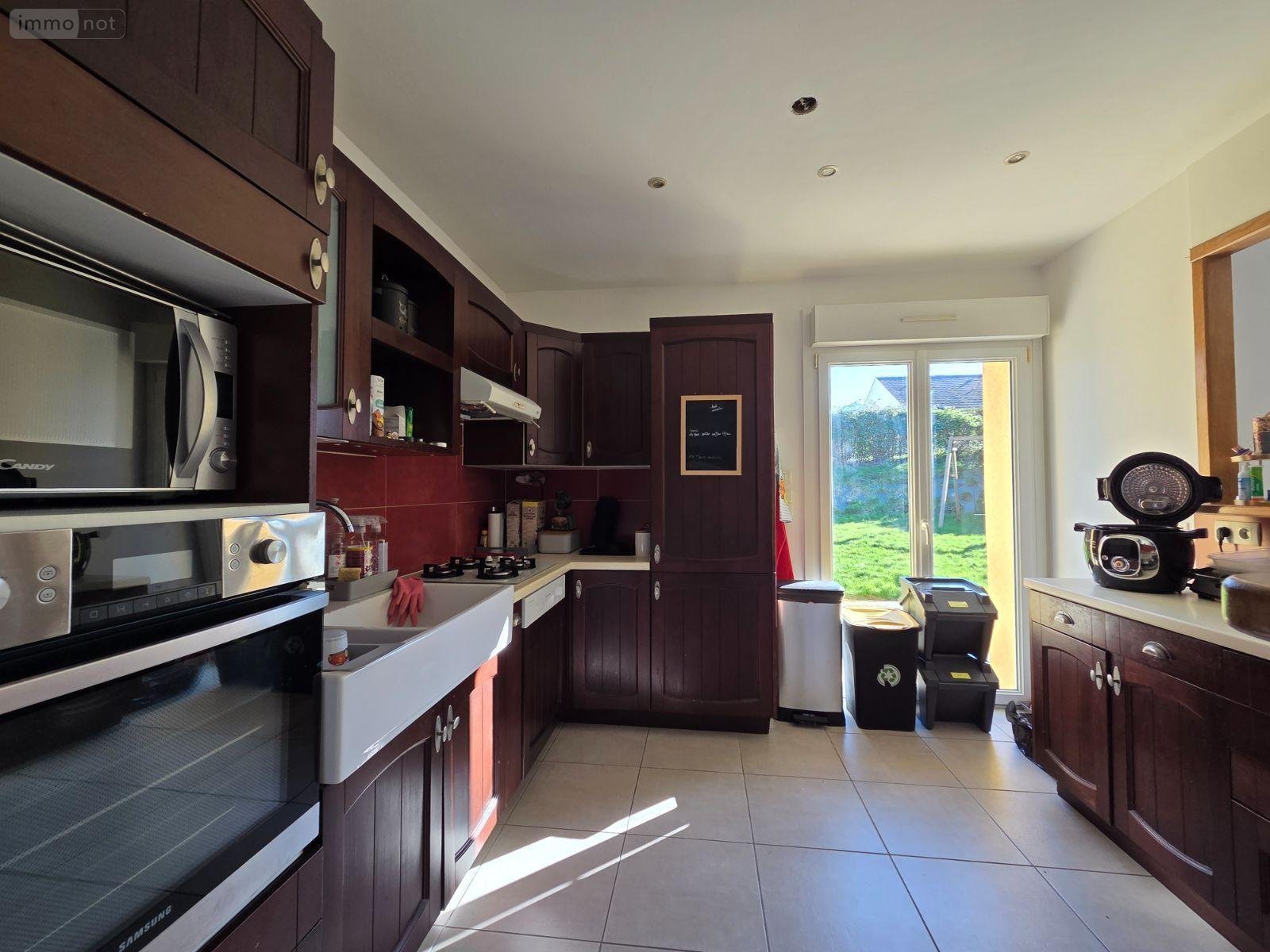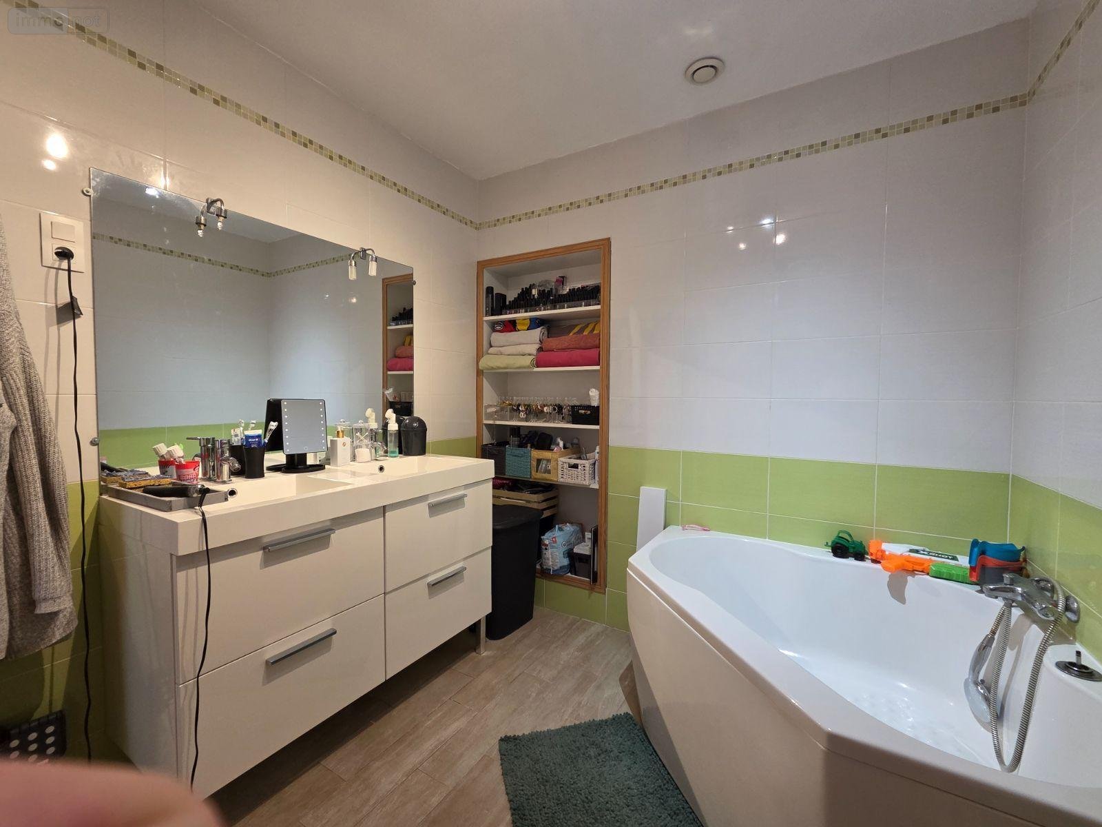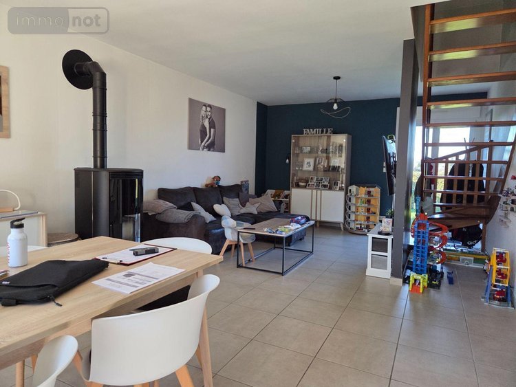 Entrée desservant salon et séjour (+ poêle à pellets) ouvert sur cuisine A/E, 1 chambre (ou bureau), salle de bains (douche et baignoire) et toilettes séparés.