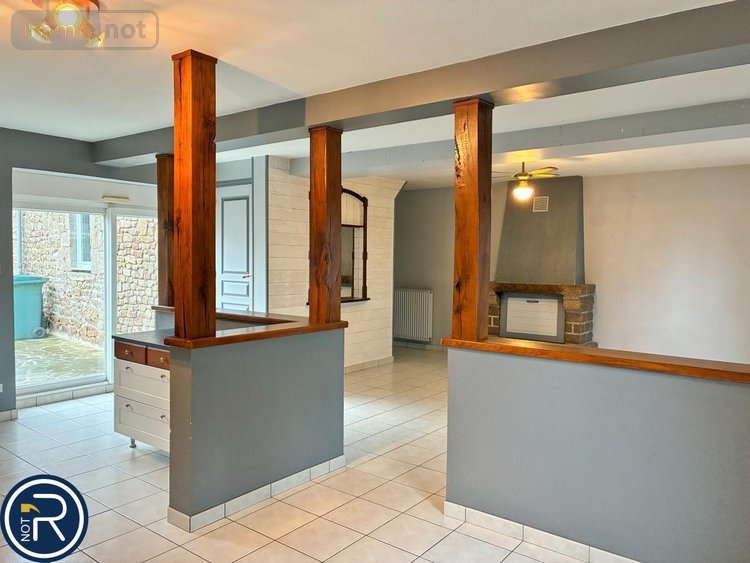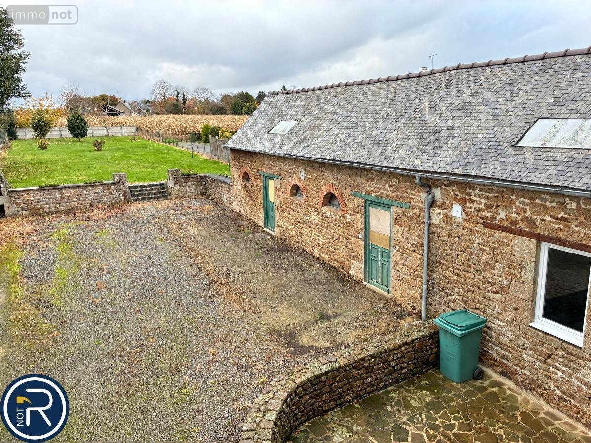 Une maison en pierres comprenant au rez de chaussée : entrée sur séjour/salon avec cheminée, cuisine ouverte, chaufferie/buanderie, w-c, atelier avec grenier au-dessus.