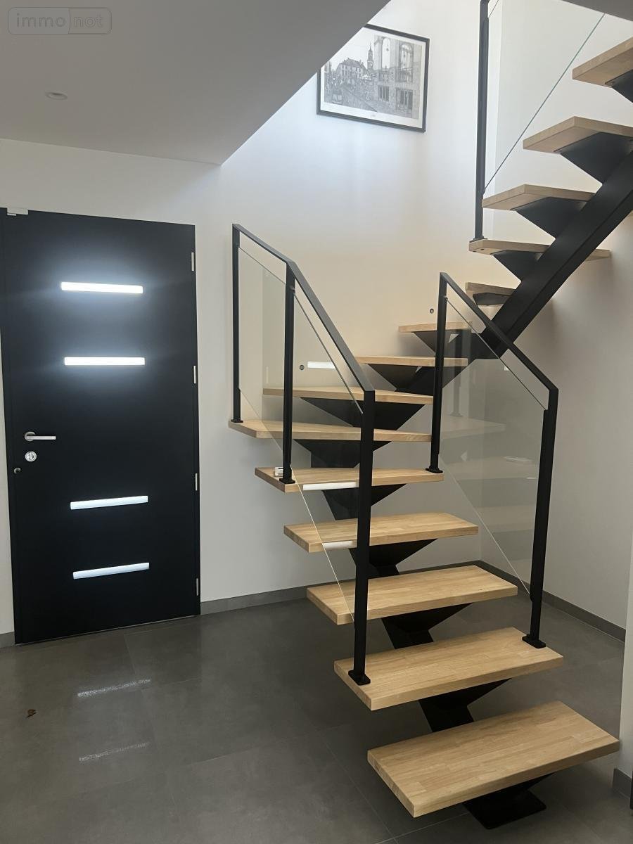 LAVAL, Maison contemporaine comprenant au rez-de-chaussée : entrée, séjour, cuisine ouverte aménagée et équipée, buanderie, une chambre, dressing, salle d'eau. Au 1er étage : trois chambres, salle de bains. Garage. Jardin. terrain de 521m².