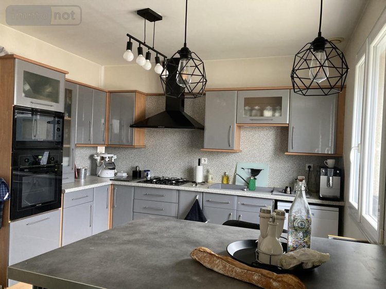 Centre St Berthevin, une maison comprenant au rez-de-chaussée, une entrée, un salon-séjour avec poêle à bois et un accès plain-pied sur une terrasse, une cuisine aménagée et équipée, trois chambres, une salle d'eau et des toilettes.