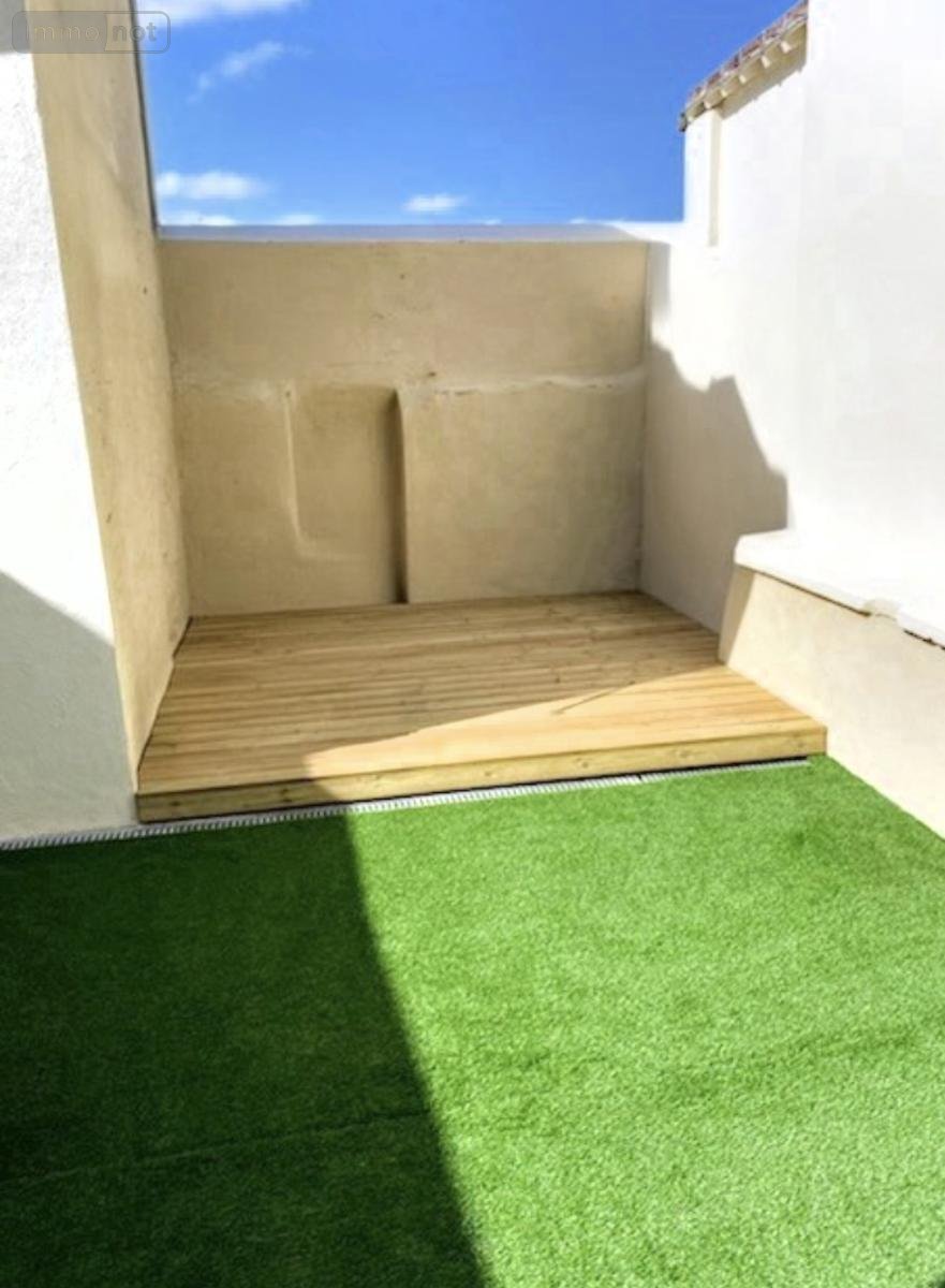 Un extérieur aménagé en pelouse synthétique avec une terrasse en bois.