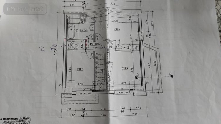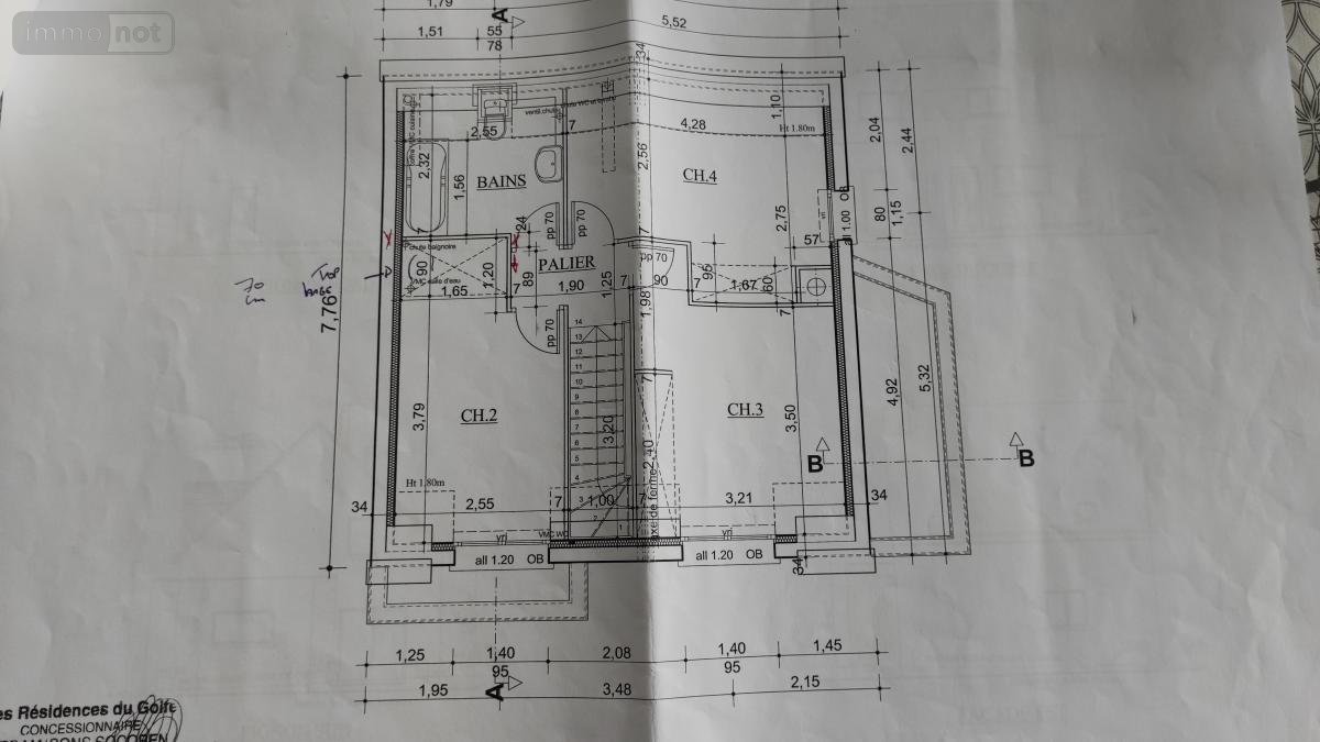 Etage : trois chambres, salle de bains, WC.